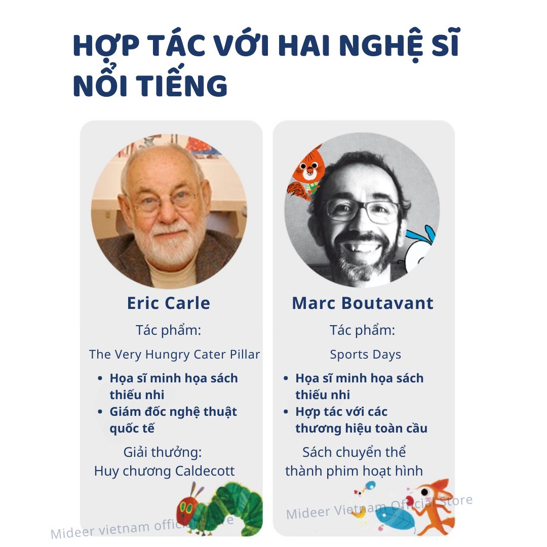 - Đặc biệt, hãng đã cộng tác với 2 họa sĩ nổi tiếng: Eric Carle: họa sĩ người Mỹ chuyên minh họa sách trẻ em và là giám đốc sáng tạo toàn cầu. Ông còn đạt giải thưởng "Caldecott Medal" - là giải thưởng uy tín, lâu đời và danh giá vinh danh những họa sĩ minh họa tài năng. Chiếc thảm Magic Doodle Mat mẫu xanh lá được ông thiết kế dựa trên sách "Chú sâu háu ăn" (The Very Hungry Cater Pillar) mà các trẻ em trên thế giới yêu thích. Marc Boutavant: họa sĩ minh họa nổi tiếng người Pháp cho sách truyện trẻ em, đã kết hợp với nhiều thương hiệu nội địa và có nhiều tác phẩm chuyển thể thành phim hoạt hình. Chiếc thảm Magic Doodle Mat mẫu xanh dương dựa trên tác phẩm Sports Days của tác giả. Nhờ vậy, con được nuôi dưỡng nhận thức thẩm mỹ, màu sắc,v.v... rất tốt mỗi khi vẽ với thảm Magic Doodle Mat.