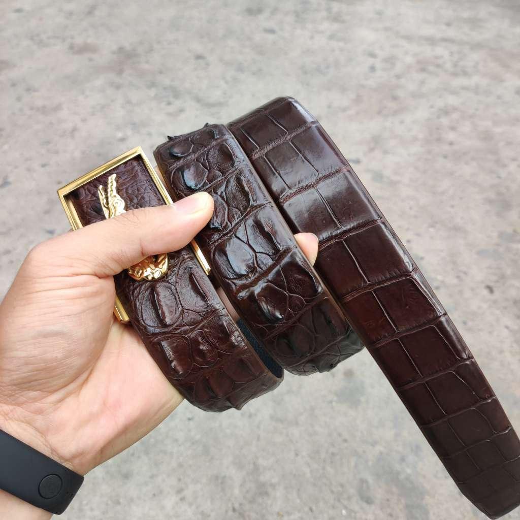 Mua tại TiktokDây liền nguyên con màu nâu bản rộng 4cm + Mặt khóa logo cá sấu nổi màu vàng gold cao cấp (thép nguyên khối ko gỉ sét)