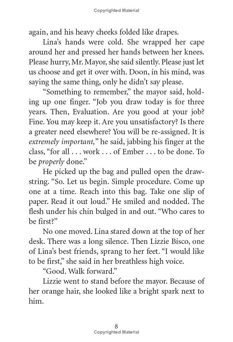 A modern-day classic. This highly acclaimed adventure series about two friends desperate to save their doomed city has captivated kids and teachers alike for almost fifteen years and has sold over 3.5 MILLION copies! The city of Ember was built as a last refuge for the human race. Two hundred years later, the great lamps that light the city are beginning to flicker. When Lina finds part of an ancient message, she's sure it holds a secret that will save the city. She and her friend Doon must race to figure out the clues before the lights go out on Ember forever! Nominated to 28 State Award Lists! An American Library Association Notable Children's Book A New York Public Library 100 Titles for Reading and Sharing Selection A Kirkus Reviews Editors' Choice A Child Magazine Best Children's Book A Mark Twain Award Winner A William Allen White Children's Book Award Winner "A realistic post-apocalyptic world. DuPrau's book leaves Doon and Lina on the verge of undiscovered country and readers wanting more." --USA Today "An electric debut." --Publishers Weekly, Starred "While Ember is colorless and dark, the book itself is rich with description." --VOYA, Starred "A harrowing journey into the unknown, and cryptic messages for readers to decipher." --Kirkus Reviews, Starred