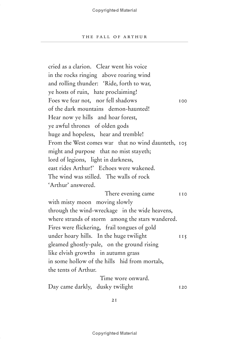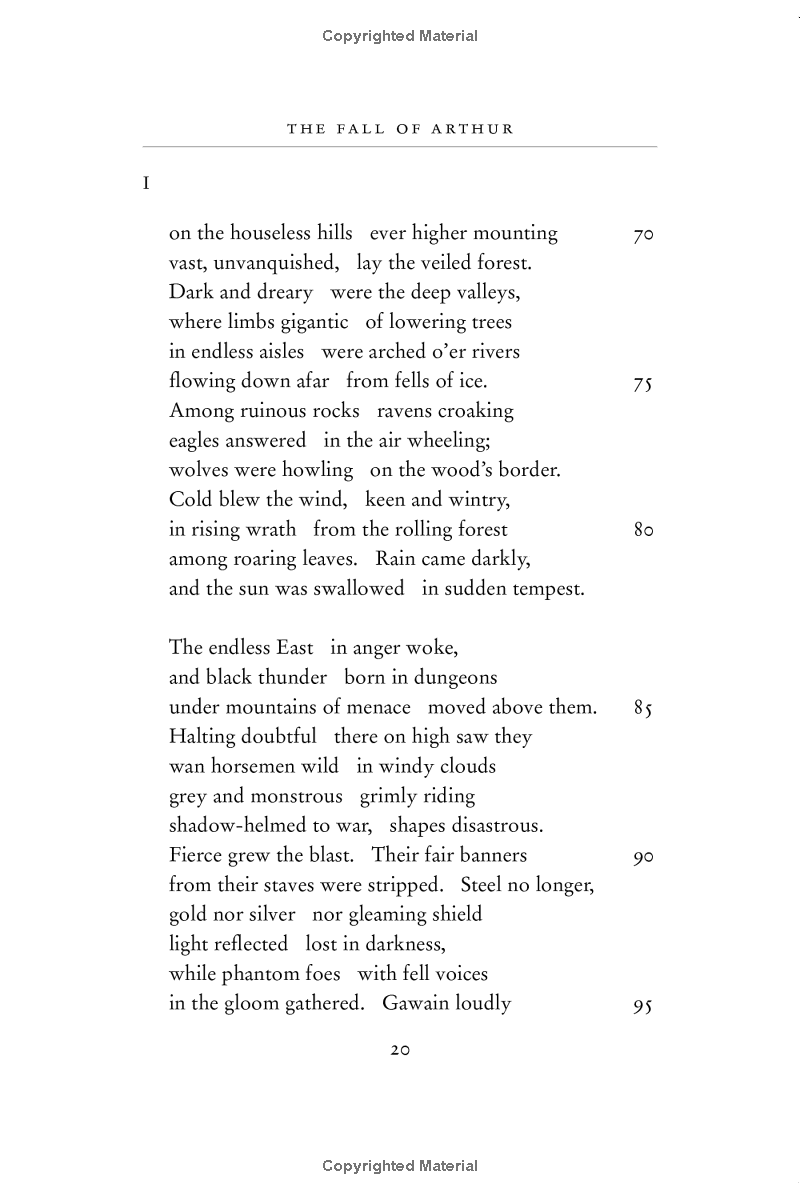 The Fall of Arthur, the only venture by J.R.R. Tolkien into the legends of Arthur King of Britain, may well be regarded as his finest and most skilful achievement in the use of the Old English alliterative metre, in which he brought to his transforming perceptions of the old narratives a pervasive sense of the grave and fateful nature of all that is told: of Arthur's expedition overseas into distant heathen lands, of Guinevere's flight from Camelot, of the great sea-battle on Arthur's return to Britain, in the portrait of the traitor Mordred, in the tormented doubts of Lancelot in his French castle.