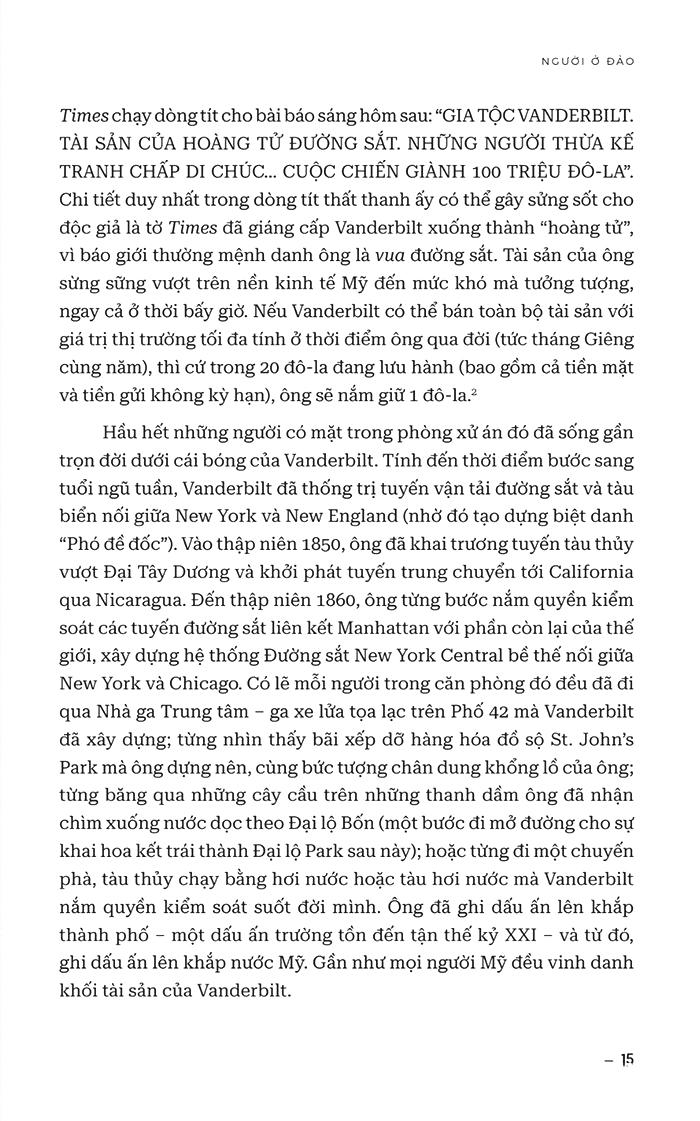 • Trong cuốn tiểu sử tuyệt vời này, Stiles phơi bày gần như mọi khía cạnh trong cuộc đời của Cornelius Vanderbilt – từ những ngày đầu tranh giành đồng xu cho đến những năm cuối đời ông giao quyền kiểm soát đế chế kinh doanh cho con trai lớn. Cuốn sách được củng cố bởi nghiên cứu đặc biệt của tác giả, thậm chí còn ấn tượng hơn bởi thực tế là Vanderbilt không ghi nhật ký và không để lại bộ sưu tập giấy tờ nào để tra cứu hay tìm hiểu.
