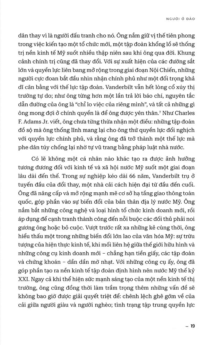 • “Thế nhưng, có lẽ ông để lại dấu ấn lâu dài nhất trong thế giới vô hình, nhờ tạo ra một kiến trúc không thể thấy bằng mắt mà hậu thế nước Mỹ sẽ coi là đương nhiên. Tư duy kinh tế hiện đại nổi lên khi Vanderbilt còn tại thế, giữa những tranh cãi dữ dội, những bối rối hoang mang và kháng cự mãnh liệt. Những công cụ thương nghiệp tưởng tượng dần dần trừu tượng hóa những công cụ hữu hình thành các biểu tượng thuần túy, và thậm chí còn ít hơn thế. Tiền biến hình đổi dạng, từ đồng xu vàng sang những tờ ngân phiếu đảm bảo bằng vàng thành những xấp tiền giấy pháp định và các khoản mục ngân hàng trong sổ cái. Tài sản biến đổi, từ các đối tượng vật lý hữu hình thành cổ phần trong các liên doanh, đến cổ phiếu ở mức mệnh giá cho tới chứng khoán biến động theo nhịp điệu thị trường với số lượng có thể tăng tùy ý. Như một hồn ma, doanh nghiệp thoát ra từ cái xác nghiệp chủ cá nhân, để rồi tự nó trở thành một thực thể, một tập đoàn với bản sắc, cá tính và nhân trạng riêng.”