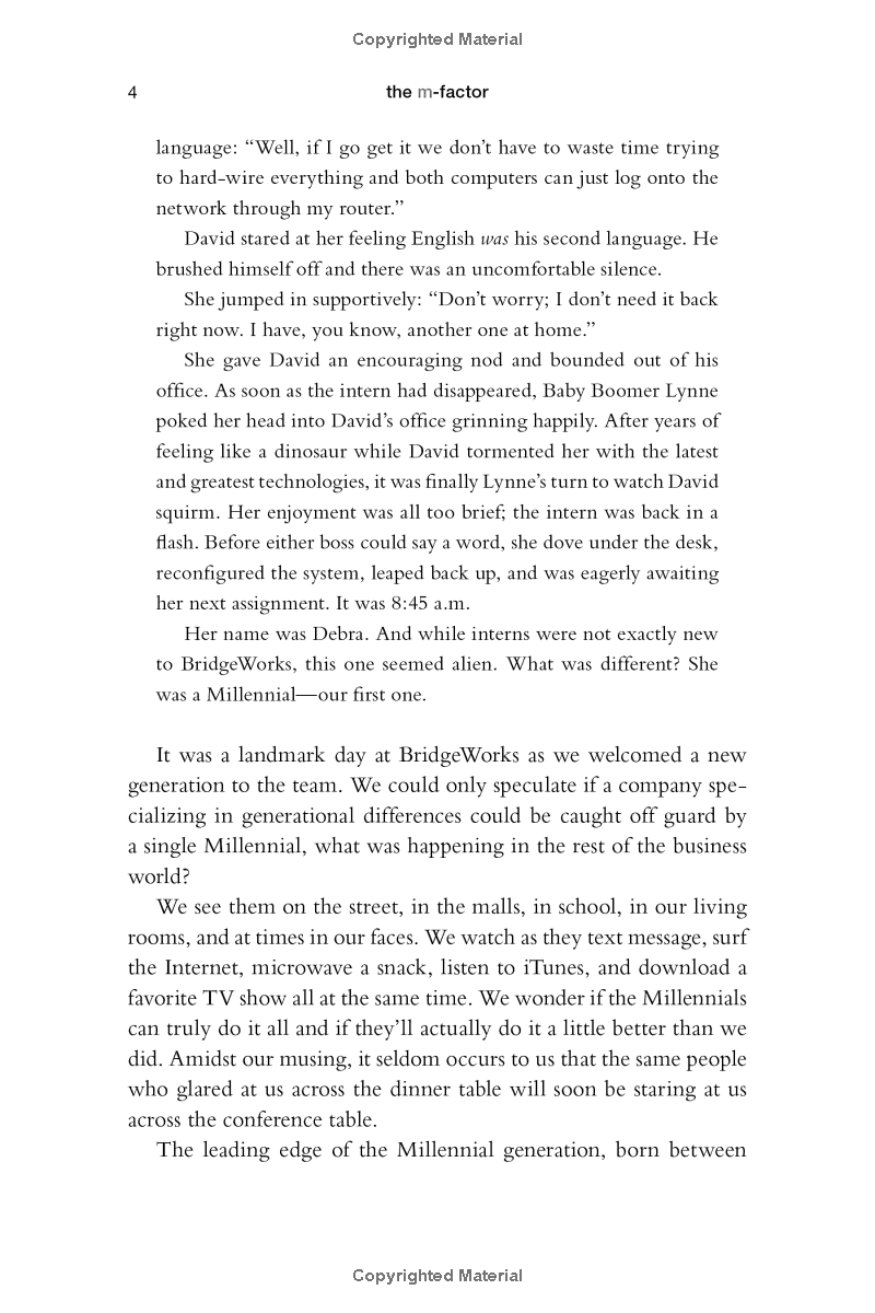 The M-Factor: How the Millennial Generation Is Rocking the Workplace From Lynne C. Lancaster and David Stillman, the nationally recognized generational experts and authors of When Generations Collide, comes the definitive guide to “Millennials” (those born