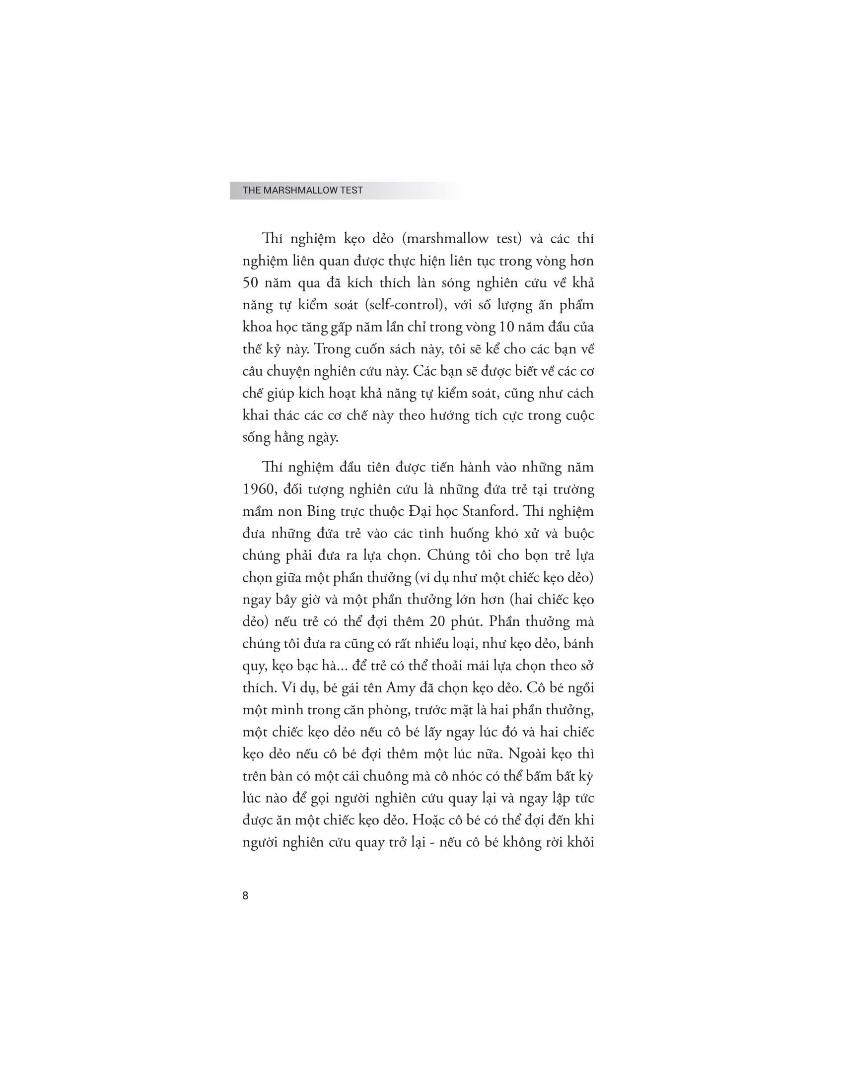 Bằng cách ứng dụng những bài học từ thí nghiệm kẹo dẻo vào cuộc sống thực tế, The Marshmallow Test không chỉ giúp người đọc hiểu rõ hơn về bản chất của tự kiểm soát mà còn cung cấp những cách thức và chiến lược hữu ích để rèn luyện khả năng này. Cuốn sách phân tích cách sự kiểm soát bản thân có thể ảnh hưởng đến nhiều khía cạnh trong cuộc sống, từ việc duy trì sức khỏe tốt, xây dựng sự nghiệp thành công đến phát triển các mối quan hệ cá nhân bền vững. Rất nhiều khía cạnh thú vị và ý nghĩa về năng lực tự chủ đã được các nhà nghiên cứu dày công tìm hiểu. Kết quả rút ra từ công trình này – sẽ giúp các bạn độc giả có một cái nhìn toàn cảnh và chuyên sâu về một trong những kỹ năng thiết yếu nhất của con người.