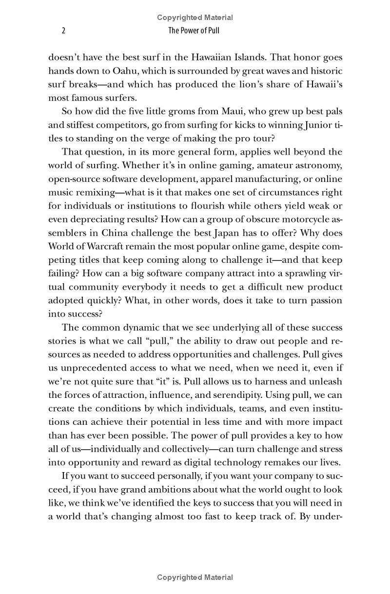 In a radical break with the past, information now flows like water, and we must learn how to tap into its stream. Individuals and companies can no longer rely on the stocks of knowledge that they've carefully built up and stored away. Information now flows like water, and we must learn how to tap into the stream. But many of us remain stuck in old practices- practices that could undermine us as we search for success and meaning. In this revolutionary book, three doyens of the Internet age, whose path-breaking work has made headlines around the world, reveal the adjustments we must make if we take these changes seriously. In a world of increasing risk and opportunity, we must understand the importance of pull . Understood and used properly, the power of pull can draw out the best in people and institutions by connecting them in ways that increase understanding and effectiveness. Pull can turn uncertainty into opportunity, and enable small moves to achieve outsized impact. Drawing on pioneering research, The Power of Pull shows how to apply its principles to unlock the hidden potential of individuals and organizations, and how to use it as a force for social change and the development of creative talent. The authors explore how to use the power of pull to: Access new sources of information Attract likeminded individuals from around the world Shape serendipity to increase the likelihood of positive chance encounters Form creation spaces to drive you and your colleagues to new heights Transform your organization to adapt to the flow of knowledge The Power of Pull is essential reading for entrepreneurs, managers, and anybody interested in understanding and harnessing the shifting forces of our networked world.