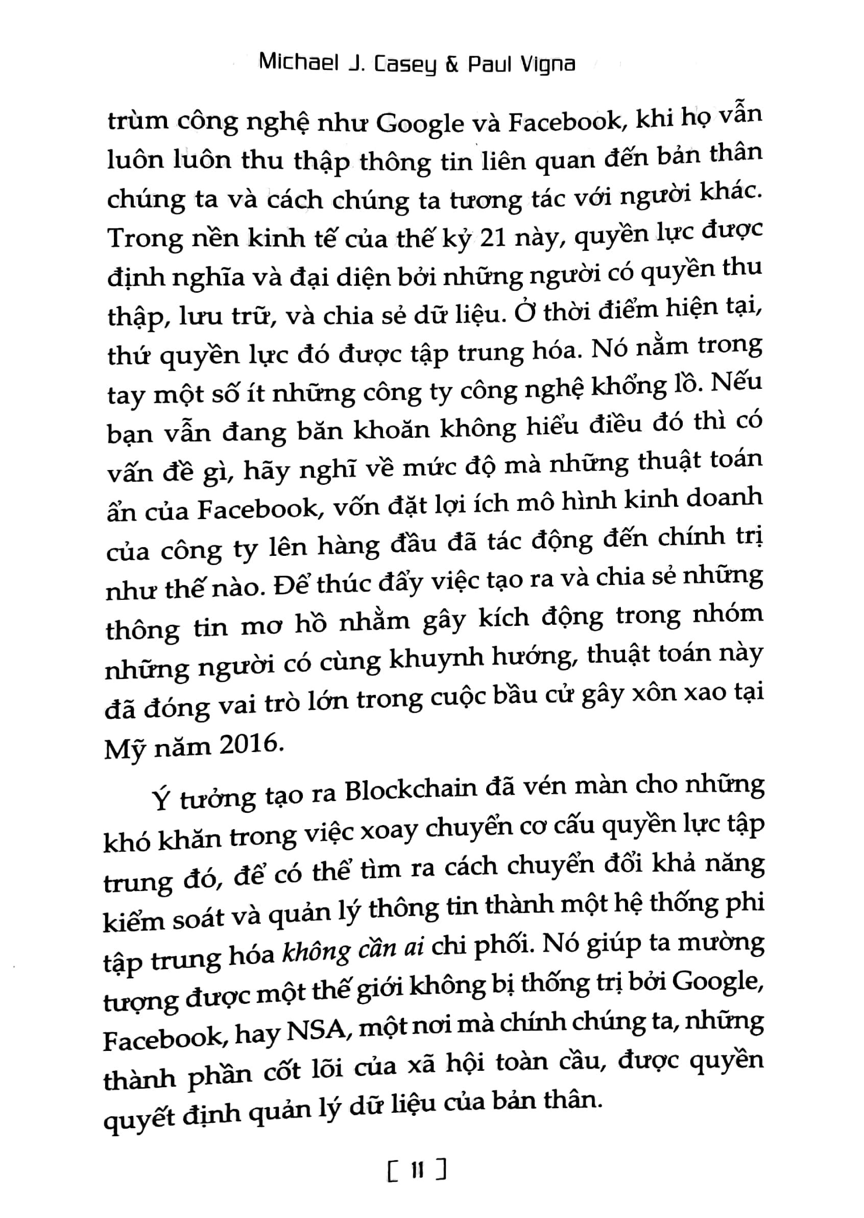 Trong "The truth machine: Blockchain và tương lai của tiền tệ", Paul Vigna và Michael J. Casey đã làm sáng tỏ vấn đề blockchain và giải thích lý do tại sao nó có thể khôi phục quyền kiểm soát cá nhân đối với dữ liệu, tài sản và danh tính của chúng ta. Cuốn sách khám phá cách thức mà công nghệ này, cũng như rất nhiều ứng dụng của nó (tiêu biểu như Bitcoin) đang hoạt động nhằm tái cơ cấu lại các tổ chức xã hội, và tạo ra vô số tiềm năng vĩ đại. Nối tiếp tác phẩm "Kỷ nguyên tiền điện tử" đã gây tiếng vang lớn, bộ đôi tác giả tiếp tục cung cấp cho người đọc một cái nhìn tổng quan hơn về xã hội trong "The truth machine: Blockchain và tương lai của tiền tệ". Đọc hết tác phẩm này, và bạn sẽ hiểu được chúng ta đang đứng trước các cơ hội và thách thức như thế nào khi ứng dụng công nghệ blockchain vào cuộc sống.