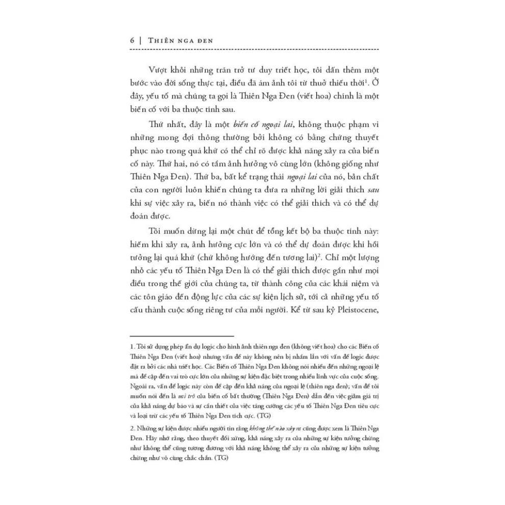 Mua tại TiktokTrước khi khám phá ra thiên nga đen tồn tại trên đời (ở Úc), người ta vẫn tin rằng tất cả chim thiên nga trên đời đều có màu trắng. Phát hiện bất ngờ này đã thay đổi toàn bộ thế giới quan của nhân loại (về thiên nga). Chúng ta không biết rất nhiều thứ nhưng lại hành động như thể mình có khả năng dự đoán được mọi điều. Và trong cuốn sách này, tác giả Nassim Nicholas Taleb đã đi sâu vào khai thác những sai lầm của tư tưởng cố hữu ấy. Theo ông, “thiên nga đen” là một biến cố tưởng chừng như không thể xảy ra với ba đặc điểm chính: không thể dự đoán, có tác động nặng nề và sau khi nó xảy ra, người ta lại dựng lên một lời giải thích để khiến nó trở nên ít ngẫu nhiên hơn, dễ dự đoán hơn so với bản chất thật của nó. Thành công đáng kinh ngạc của Fb có thể được coi là một “thiên nga đen”, việc nước Anh rời khỏi Liên minh châu Âu cũng là một “thiên nga đen”. Thiên nga đen luôn ẩn hiện trong mọi mặt của cuộc sống với những tác động khó lường, theo cả hướng tiêu cực và tích cực. Tinh tế, táo bạo nhưng không kém phần thú vị, Thiên Nga Đen chắc chắn là cuốn sách không thể bỏ qua cho những ai đam mê hiểu biết. Và cuốn sách này, bản thân nó cũng chính là một thiên nga đen…
