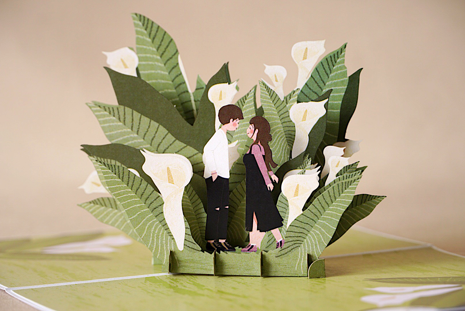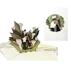 Thể hiện tình cảm ngọt ngào bằng thiệp 3D Pop Up cặp đôi giữa vườn hoa loa kèn. Khi mở thiệp, hình ảnh đôi tình nhân bật nổi giữa những bông loa kèn trắng tinh