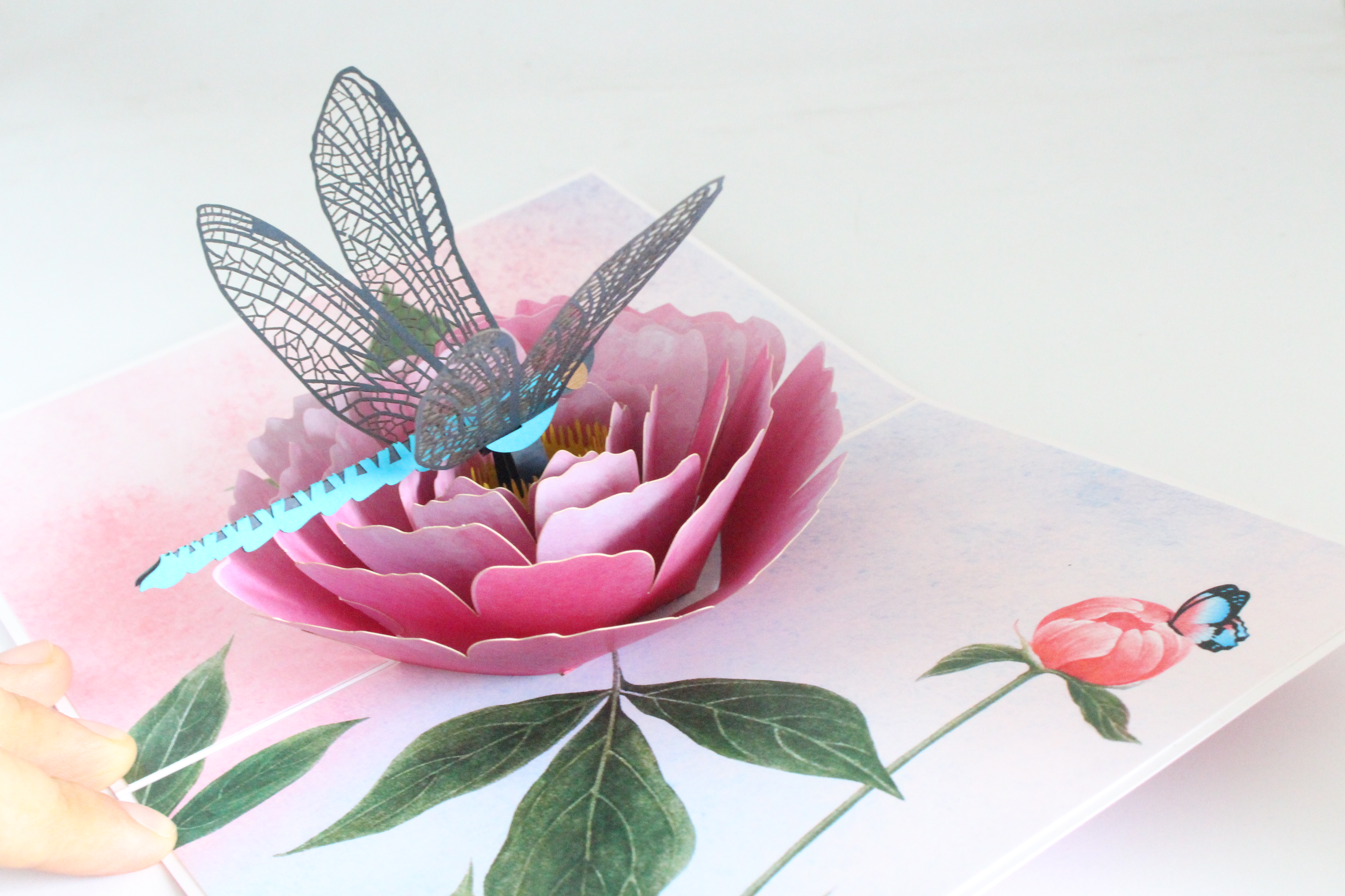 Thổi hồn thiên nhiên vào món quà tặng với thiệp 3D Pop Up chuồn chuồn & hoa mẫu đơn. Khi mở ra, hình ảnh chuồn chuồn xanh bật nổi với đôi cánh trong suốt bay