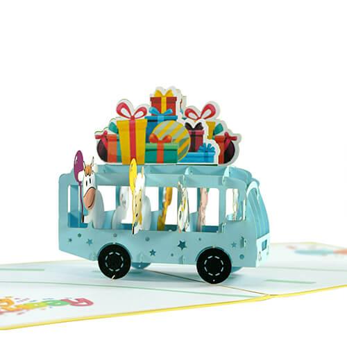 Mang đến sự bất ngờ và niềm vui cho người thân với thiệp 3D Pop Up hình xe buýt chở đầy quà sinh nhật. Khi mở ra, chiếc xe buýt màu xanh bật nổi, bên