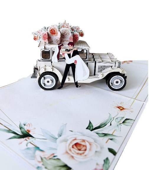 Thiết kế 3D tinh tế: Xe cưới cổ điển bật nổi kèm hoa tươi và cô dâu chú rể.
