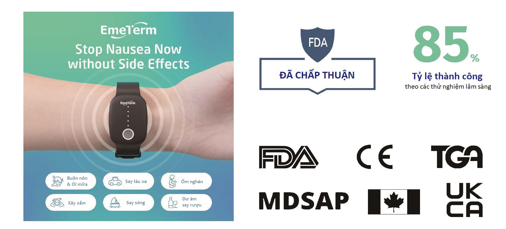 EmeTerm Explore là thiết bị đeo tay sử dụng công nghệ TENS (dùng các xung điện nhỏ và chính xác để kích thích điện thần kinh không xâm lấn, bao gồm kích thích dây thần kinh điện xuyên da) giúp chống buồn nôn an toàn và hiệu quả, giúp ngăn ngừa và giảm buồn nôn và nôn mữa do say tàu xe (khi đi ô tô, thuyền hoặc máy bay) và ốm nghén (khi mang thai).