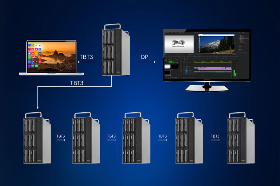 Chỉ với một dây cáp, cổng Thunderbolt 3 giúp người dùng có thể kết nối nhiều hơn 5 thiết bị DAS với máy tính. Từ đó, bạn có thể đạt đến giới hạn lưu trữ 800TB khổng lồ bằng cách liên kết 6 DAS D8-332 lại với nhau.