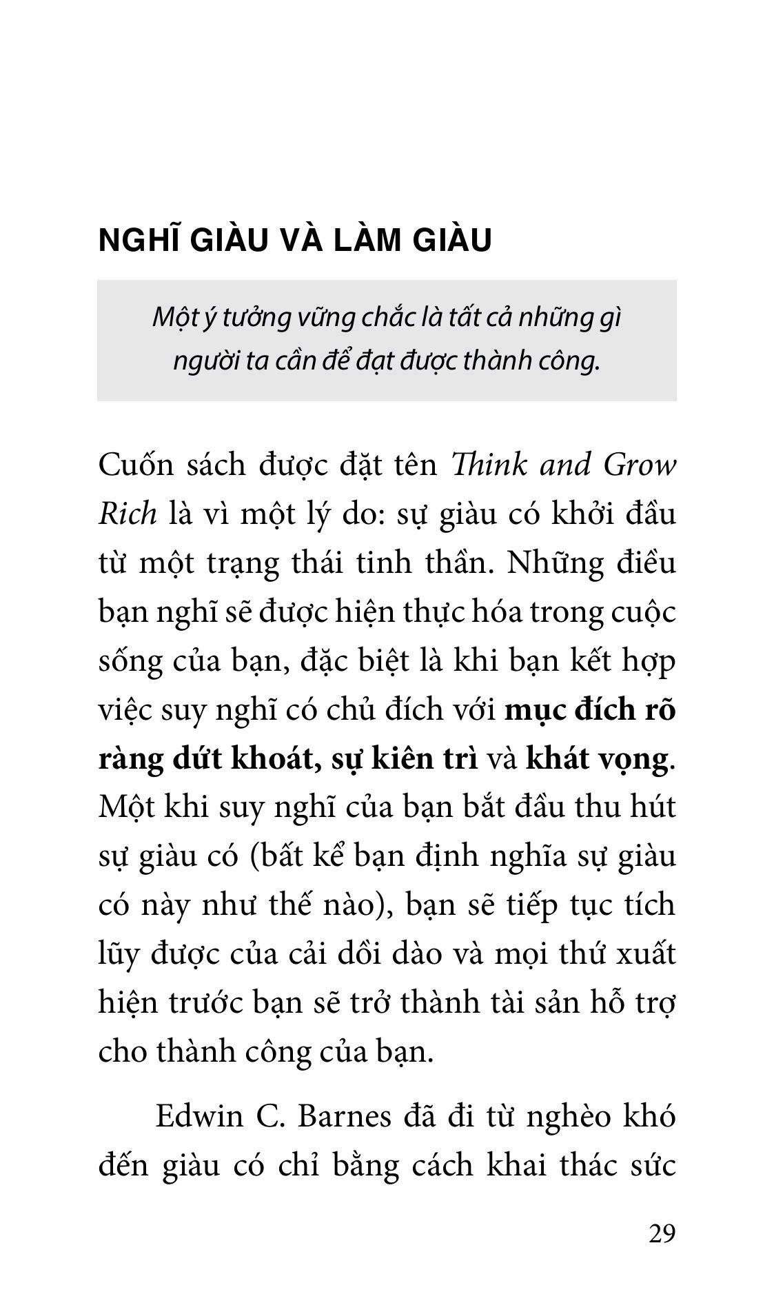 Think and Grow Rich không phải là cuốn sách bạn đọc một lần rồi đặt sang một bên. Đây là cuốn sách bạn đọc đi đọc lại tuần này qua tuần khác, tháng này qua tháng khác, năm này qua năm khác để nâng cao ý thức về thành công và tối đa hóa khả năng biến mục tiêu chính rõ ràng dứt khoát của mình thành hiện thực. Những doanh nhân vĩ đại nhất thế giới sẽ cho bạn biết rằng họ nghiền ngẫm lại các nguyên tắc trong cuốn sách của Hill ít nhất một lần mỗi năm để đảm bảo các ý tưởng luôn mới mẻ trong tâm trí họ.