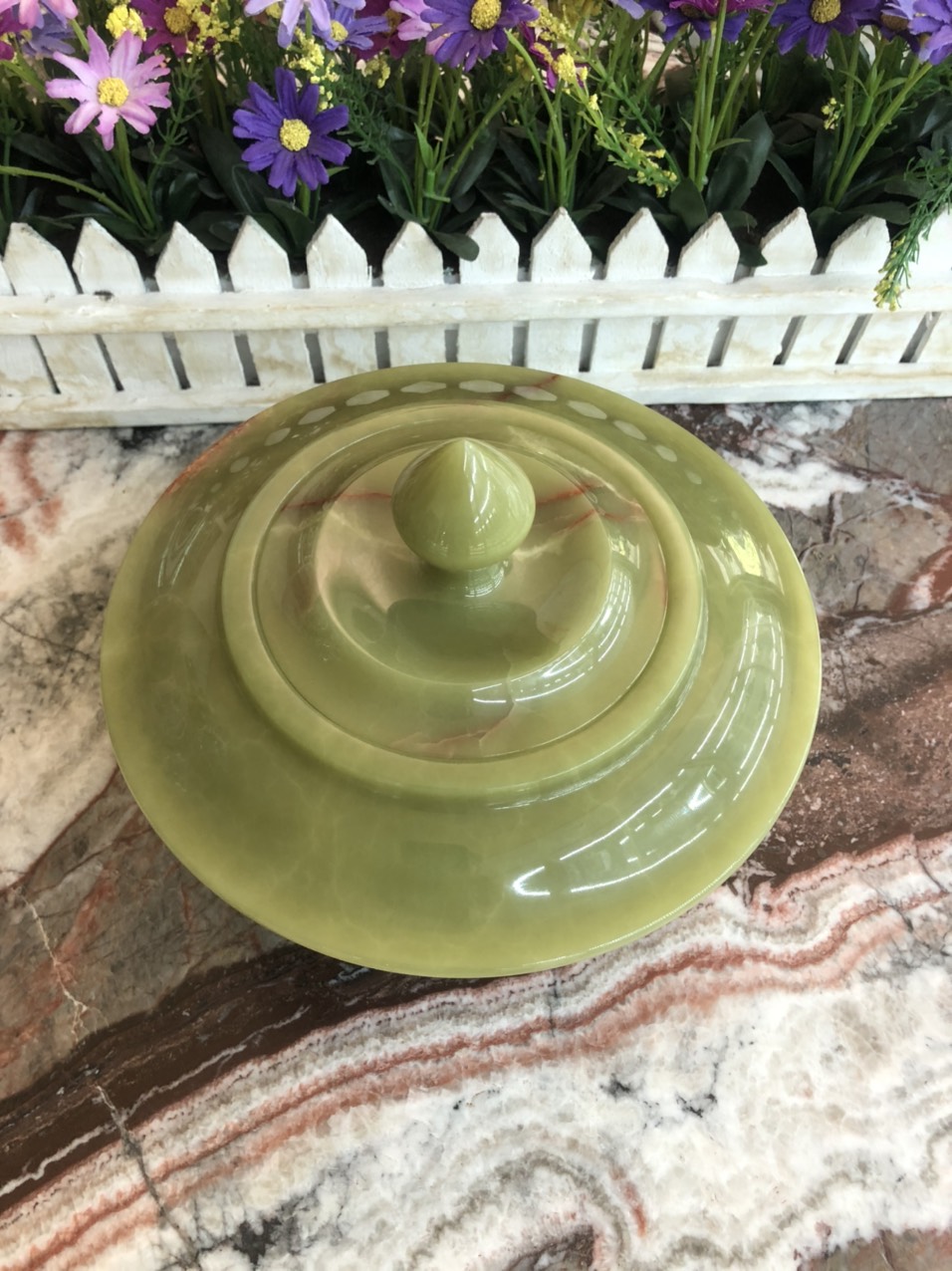 Kích thước: Đường kính 22 cm, Cao 16 cm Khối lượng: 2,5 kg Chất liệu: Đá ngọc Onyx Tặng kèm đế gỗ xoay Cách dùng: Dùng đựng nữ trang, đồ dùng cá nhân văn phòng