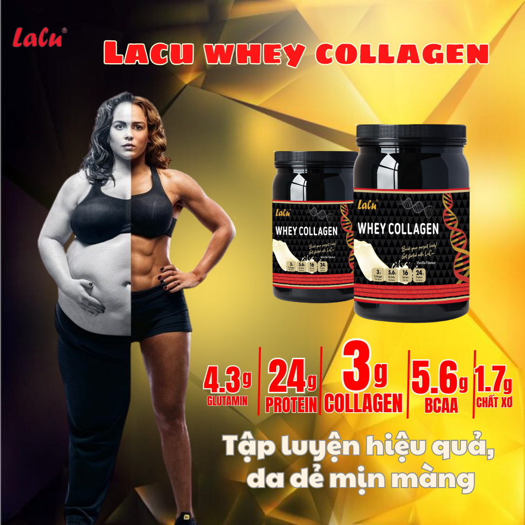 Mua tại TiktokLacu Whey Collagen – Sự kết hợp hoàn hảo giữa sức mạnh và vẻ đẹp Lacu Whey Collagen là sản phẩm dinh dưỡng cao cấp, được thiết kế đặc biệt để không chỉ hỗ trợ quá trình phát triển cơ bắp mà còn nuôi dưỡng làn da khỏe mạnh từ bên trong. Với sự kết hợp độc đáo giữa whey protein và collagen tuýp 1 và 3, sản phẩm này mang đến lợi ích vượt trội cho những người tập luyện thể thao và quan tâm đến vẻ đẹp. Thành phần nổi bật: