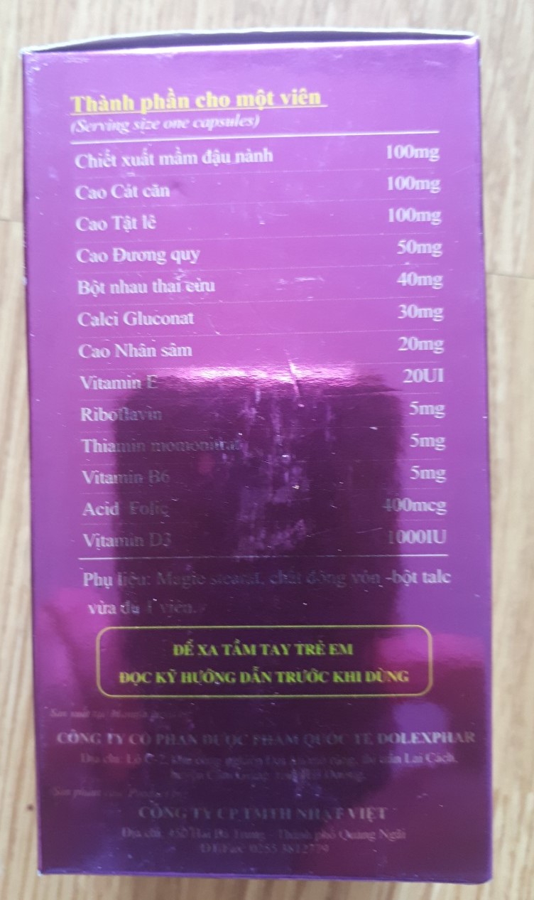 Mua tại TiktokQuy Cách Đóng Gói: Hộp 30 viên Công dụng : Hỗ trợ tăng cường nội tiết tố nữ, giảm các biểu hiện thiếu hụt nội tiết tố estrogen ở phụ nữ tiền mãn kinh, mãn kinh, suy giảm chức năng sinh lý nữ. Hỗ trợ giảm nám, tàn nhang, hỗ trợ da sáng đẹp, mịn màng. Đối tượng sử dụng:
