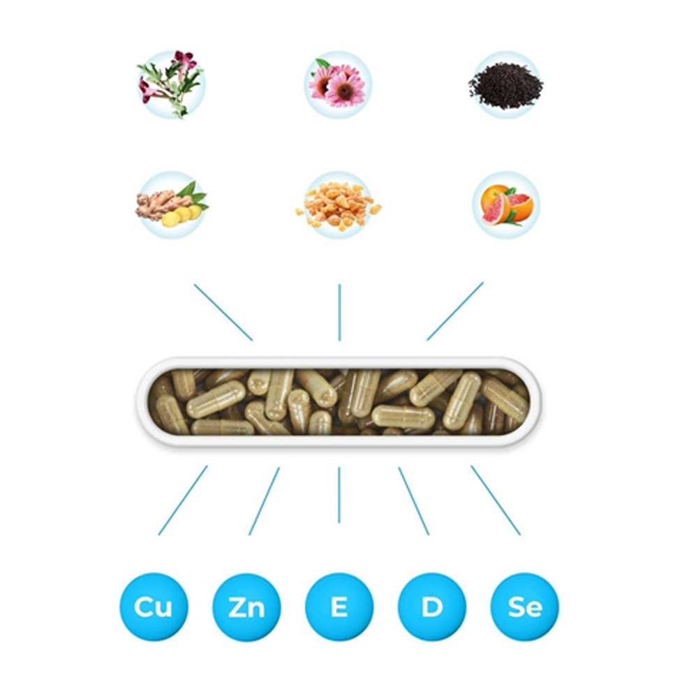 THÀNH PHẦN: Harpagophytum, bột rễ (400mg), Hoa cúc tím, bột rễ (100mg), Vitamin C (40 mg), Chiết xuất hạt bưởi (40mg), Bột hạt cumin đen (20mg), Chiết xuất nghệ (24mg), Bột nhựa cây Nhũ hương (20mg), Bột gừng (20mg), Kẽm (12mg), Vitamin E (10mg), Đồng (2mg), Selen (0,06mg), Vitamin D3 (0,01mg)
