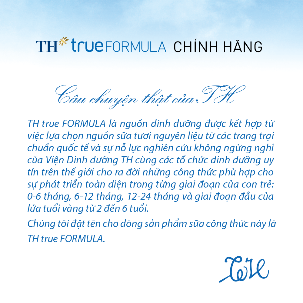 - Bảo quản nơi khô ráo và thoáng mát. Xuất xứ: Việt Nam Nơi sản xuất: Việt Nam Thương hiệu: TH true FORMULA Ngày sản xuất: In trên bao bì sản phẩm Hạn sử dụng: 06 tháng kể từ ngày sản xuất THÔNG TIN THƯƠNG HIỆU TH true FORMULA là nguồn dinh dưỡng được kết hợp từ việc lựa chọn nguồn sữa tươi nguyên liệu từ các trang trại chuẩn quốc tế và sự nỗ lực nghiên cứu không ngừng nghỉ của Viện Dinh dưỡng TH cùng các tổ chức dinh dưỡng uy tín trên thế giới cho ra đời những công thức phù hợp cho sự phát triển toàn diện trong từng giai đoạn của con trẻ. Chúng tôi đặt tên cho dòng sản phẩm sữa công thức này là TH true FORMULA.