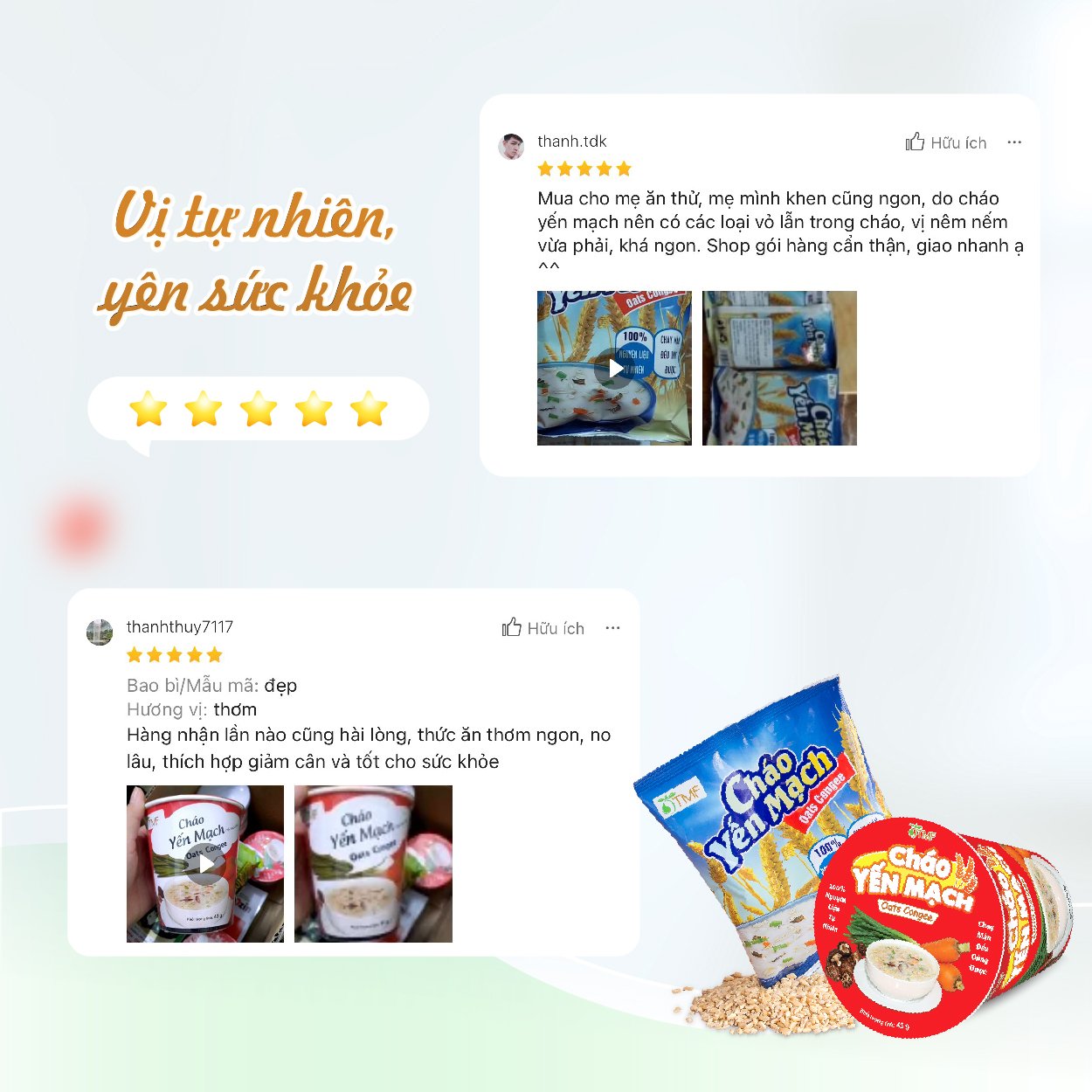 Thành phần: Yến mạch (50%), gạo lứt (40%), củ ngưu báng, nấm đông cô, cà rốt, gia vị: muối, hành, tiêu