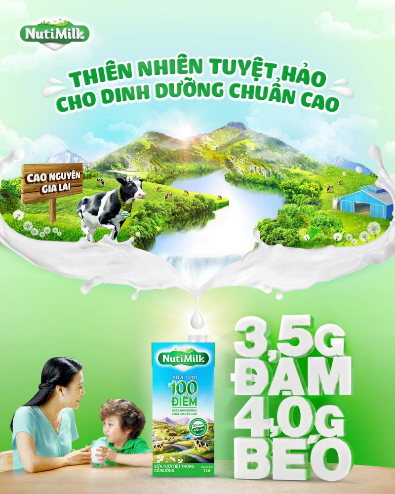 Nhờ thừa hưởng tất cả yếu tố "thiên thời địa lợi nhân hòa" về điều kiện tự nhiên, phương pháp chăn nuôi và sự tham gia của các chuyên gia từ Thụy Điển, dòng sản phẩm NutiMilk Sữa tươi 100 điểm có hàm lượng dinh dưỡng lên đến 3,5g Đạm và 4,0g Béo trong 100 ml, tương đương sữa tươi ngoại nhập.