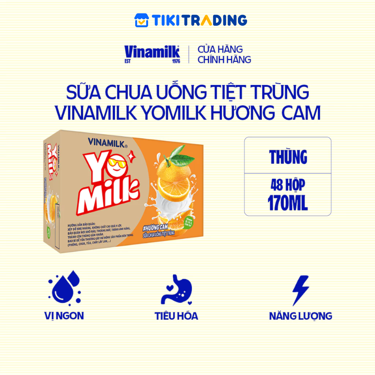 Mua tại TiktokĐể đảm bảo chất lượng sản phẩm tốt nhất, các đơn hàng bao gồm kem, sữa chua ăn và sữa chua uống sẽ chỉ được giao trong bán kính 10km từ cửa hàng Vinamilk gần nhất. Đơn hàng của bạn có thể sẽ được hủy nếu không có cửa hàng Vinamilk trong vòng bán kính 10km từ địa chỉ nhận hàng. Sữa chua uống hương cam Yomilk - Lốc 4 hộp giấy x 170ml • Sữa chua uống Yomilk Hương Cam, giàu dưỡng chất từ sữa lên men tự nhiên với chủng men thuần khiết Bulgaricus từ châu Âu, kết hợp cùng hương vị Cam thơm ngon, cung cấp nguồn năng lượng dồi dào, giúp cơ thể tươi trẻ, đầy sức sống mỗi ngày. • Quy cách thùng: 12 lốc/thùng • Thực phẩm bổ sung