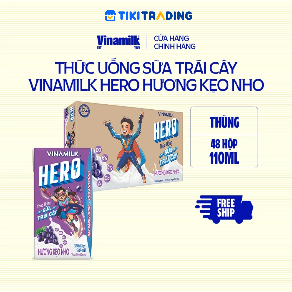 ✨Thùng 48 hộp thức uống sữa trái cây vị kẹo nho Vinamilk Hero 110ml