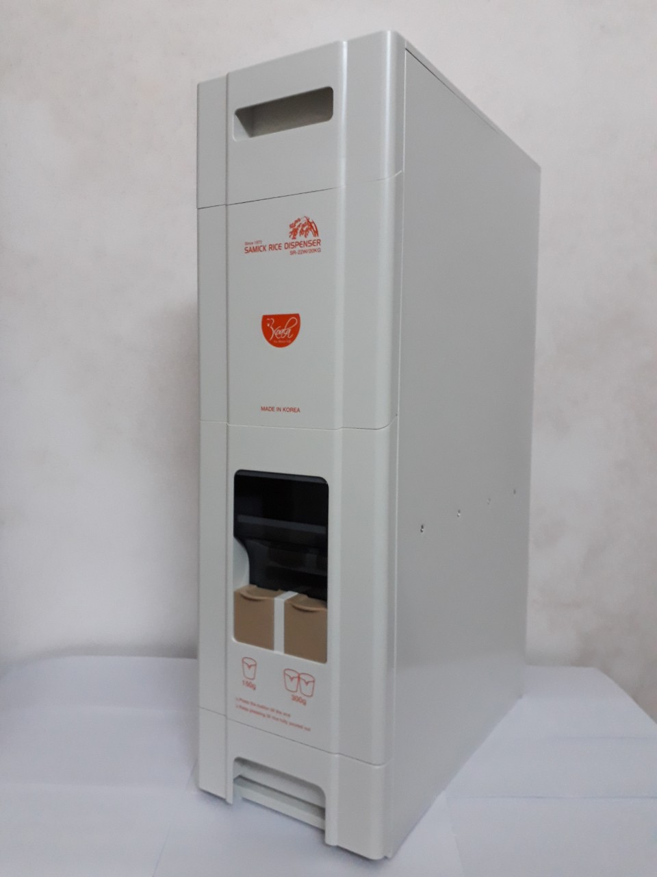 Thùng đựng gạo có 2 nút ấn lấy gạo: nút thứ nhất 150g, nút thứ hai 300g. Bạn chỉ cần ấn nút, gạo sẽ chảy xuống khay chứa đúng trọng lượng. Bạn có thể tự ước lượng số gạo cần lấy một cách chuẩn xác nhất.