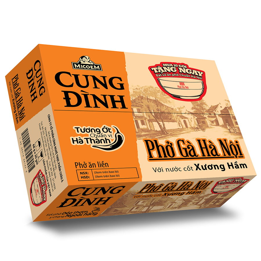 - Thùng 12 Hộp Phở Gà Hà Nội Cung Đình (73g/ Hộp) với nước cốt xương hầm và tương ớt chuẩn vị Hà Thành, chỉ cần vài phút cho khâu chuẩn bị và chế biến
