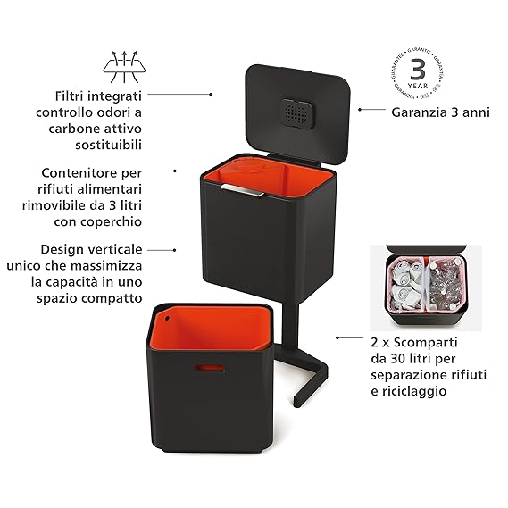 ✨Thùng rác 2 ngăn Joseph Joseph 30106 Totem Max 60L màu đen carbon Hàng chính hãng