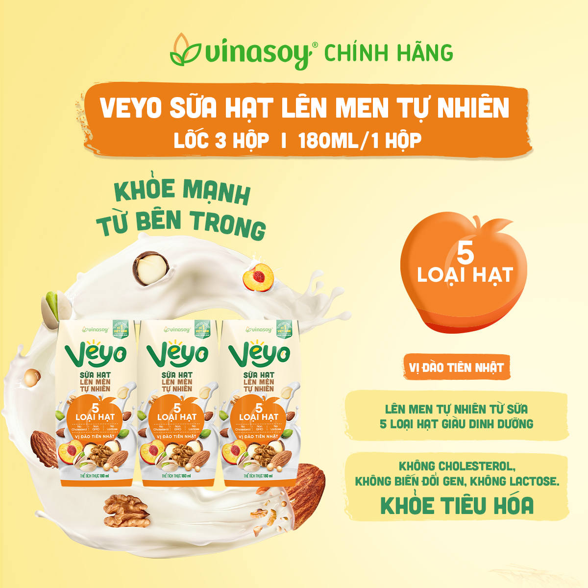 - VEYO SỮA HẠT 5 LOẠI CAO CẤP nguồn dinh dưỡng trọn vẹn từ ÓC CHÓ, HẠNH NHÂN, MẮC CA, YẾN MẠCH, DẺ CƯỜI mang đến vị ngọt dịu nhẹ, bùi béo tự nhiên, hòa