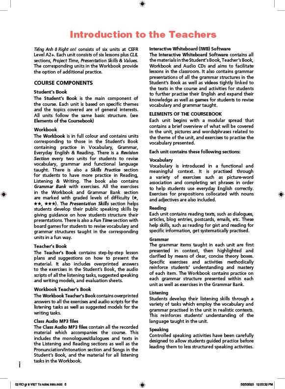 Mua tại TiktokRight on! là một khóa học 4 cấp độ dành cho học sinh trung học tiếng Anh. Bộ sách bao gồm chương trình học quốc gia của Bộ Giáo dục và Đào tạo Việt Nam (MOET) và liên kết chặt chẽ với Tham chiếu Khung về Ngôn ngữ (CEFR). Right o! cung cấp các chủ đề phong phú để phát triển các kỹ năng của thế kỷ 21 mà học sinh cần đối mặt thách thức của thế giới hiện đại. Tài liệu kỹ thuật số đi kèm với khóa học chứa rất nhiều các hoạt động tương tác, video và trò chơi đích thực để thu hút mọi đối tượng người học. Tiếng Anh 8 Right on! đã được Bộ Giáo dục và Đào tạo thẩm định và phê duyệt