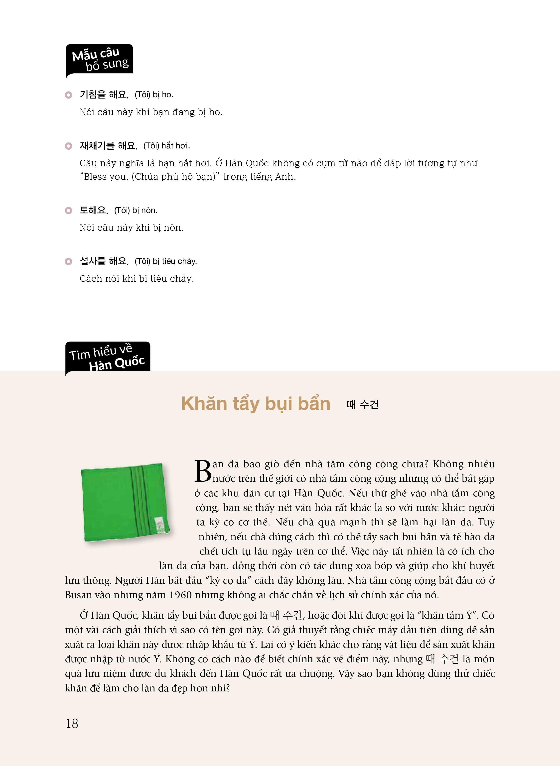 • Ở cuối mỗi chủ đề là những câu chuyện thú vị về văn hóa, đời sống và lịch sử Hàn Quốc mà trong đó, ngôn ngữ được lồng ghép khéo léo. Bạn sẽ biết thêm về củ cải muối, thịt ba chỉ muối, phong cách nhuộm màu tự nhiên và rất nhiều nét đặc trưng khác của xứ sở kim chi. Những câu chuyện này sẽ giúp bạn cảm nhận vẻ đẹp của Hàn Quốc, hiểu được văn hóa thẩm thấu trong ngôn ngữ như thế nào, từ đó thêm yêu tiếng Hàn và có động lực học ngôn ngữ này hơn.