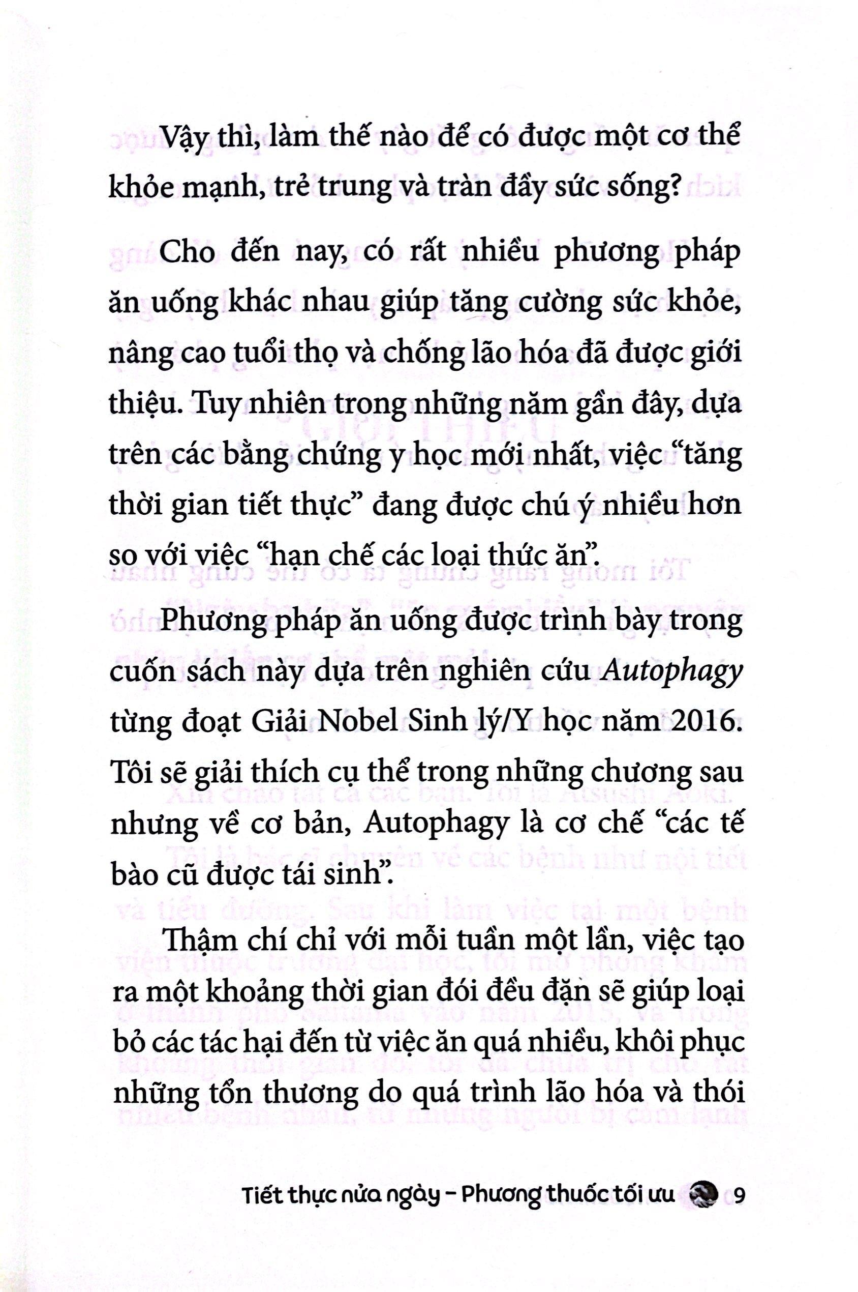 Phương pháp ăn uống được trình bày trong Tiết Thực Nửa Ngày dựa trên nghiên cứu Autophagy từng đoạt giải Nobel Sinh lý/Y học năm 2016. Cuốn sách là kim chỉ nam cho bất cứ ai muốn khỏe mạnh, đặc biệt là những người: