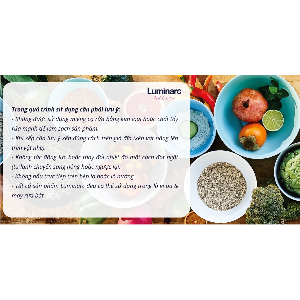Tô Thủy Tinh Luminarc Diwali Precious 18CM. - Quy cách : 3 cái. - Kích thước: 18 cm. - Chất liệu: Thuỷ tinh opal, cường lực, kháng vỡ. - Có thể sử dụng trong lò