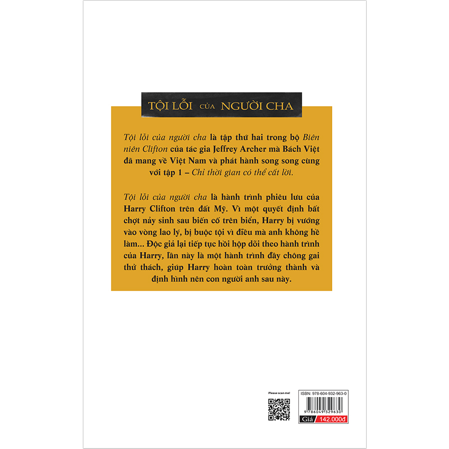 “Tội lỗi của người cha” là tập thứ hai trong bộ Biên niên Clifton của tác gia Jeffrey Archer, mà trước đó Bách Việt đã mang tới cho độc giả Việt Nam tập 1 cuốn “Chỉ thời gian có thể cất lời”.