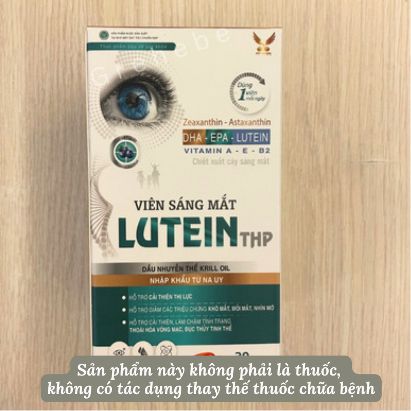Lutein THP có chứa dầu cá, DHA, dầu gấc, lutein, chiết xuất cây sáng mắt,… hỗ trợ cải thiện thị lực; hỗ trợ giảm các triệu chứng: khô mắt, nhìn mờ, mỏi mắt.