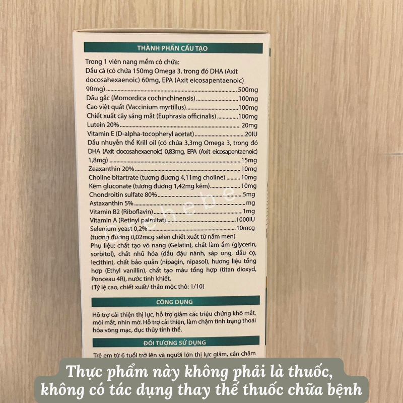 1. THÀNH PHẦN Mỗi viên nang mềm có chứa: Omega 3 25%: ..200mg Cao việt quất: .50mg Cao bạch quả: 20mg (ginkgo biloba extract) Dầu gấc: ....15mg Lutein 5%: ..10mg Astaxanthin 5%: 5mg Vitamin B2: