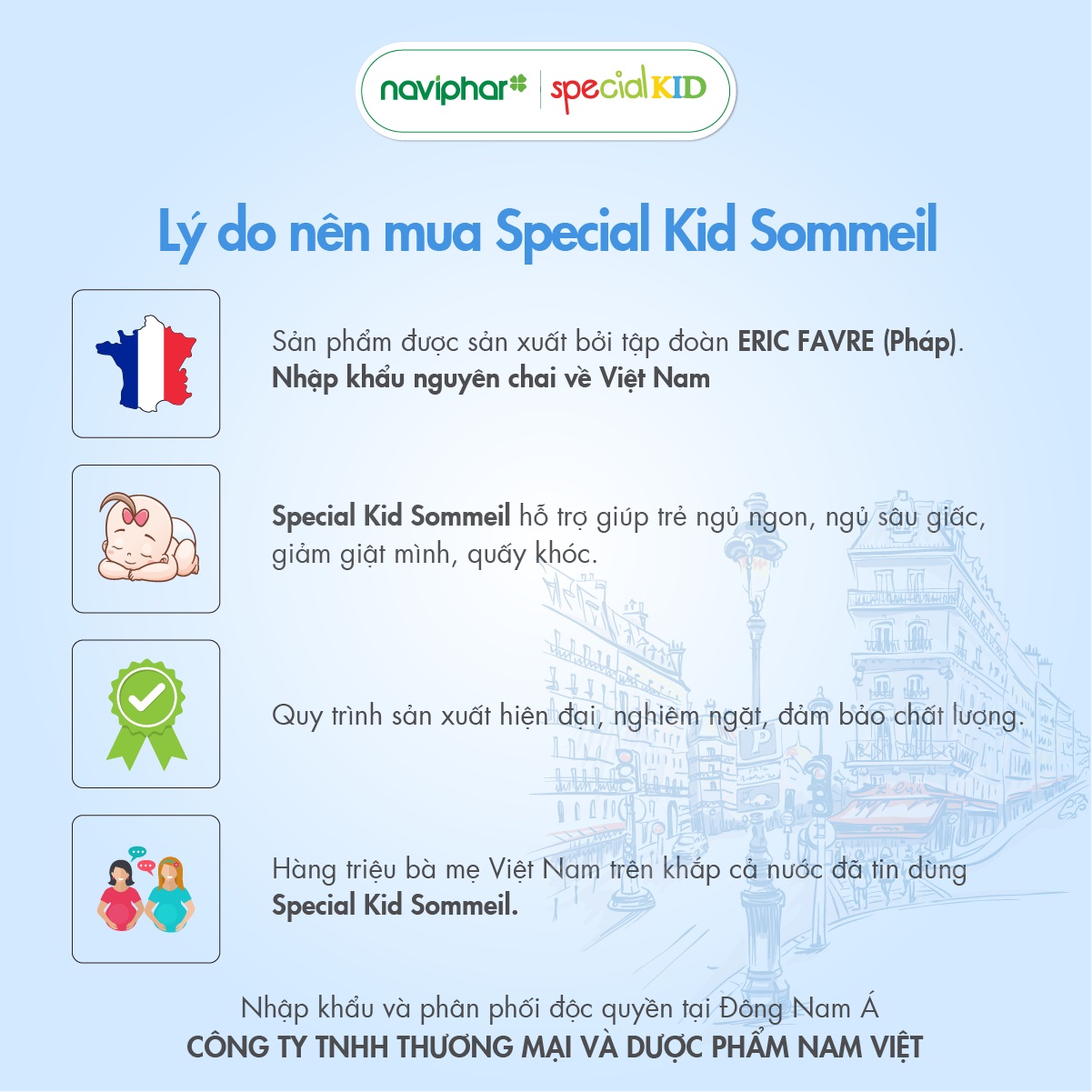 Special Kid là thương hiệu nhập khẩu nguyên hộp từ Pháp, đáp ứng hầu hết nhu cầu phòng và hỗ trợ điều trị các bệnh thường gặp của trẻ trong những năm tháng đầu đời. Special Kid Sommeil được bào chế chuyên biệt dành cho trẻ em, mùi vị dễ chịu, chỉ cần sử dụng 1 lần/ngày. Tiết kiệm. Dễ nhớ