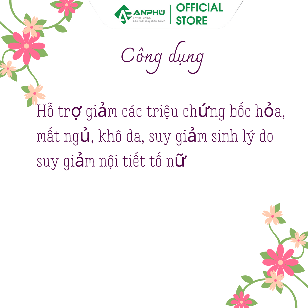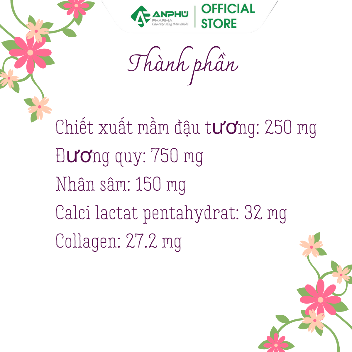 - Công ty Dược phẩm An Phú chúng tôi có hơn 10 năm uy tín trong lĩnh vực dược phẩm cam kết mang đến những sản phẩm bảo vệ sức khỏe tốt nhất. THÀNH PHẦN Chiết xuất mầm đậu tương (tương đương 3,75mg isoflavon) 250mg Cao khô hỗn hợp thảo mộc: 100mg (tương đương với Đương quy (Radix Angelicae sinensis) 750 mg Nhân sâm (Radix et Rhizoma Ginseng)) 150 mg Calci lactat pentahydrat 32mg Collagen 27,2mg Phụ liệu: Chất tạo dính (PEG 6000, Polysorbate 80; Chất chống đông vón (Magnesi stearate); Chất độn (Tinh bột, Calci carbonat, Microcrystalline cellulose; Chất bảo quản (Kali sorbat); vỏ nang gelatin CÔNG DỤNG Hỗ trợ giảm các triệu chứng bốc hỏa, mất ngủ, khô da, suy giảm sinh lý do suy giảm nội tiết tố nữ. ĐỐI TƯỢNG SỬ DỤNG Phụ nữ có các biểu hiện rối loạn thời kỳ mãn kinh, tiền mãn kinh. CÁCH DÙNG