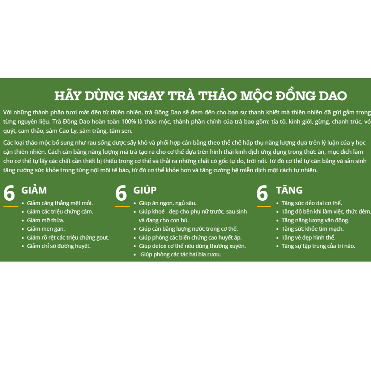 MÔ TẢ : - Với những thành phần tươi mát đến từ thiên nhiên,trà ăn ngon ngủ ngon Đồng Dao sẽ đem đến cho bạn sự thanh khiết mà thiên nhiên đã gửi gắm trong