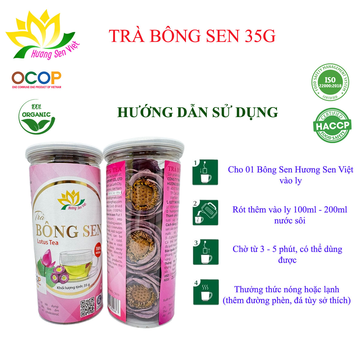 - Cung cấp Vitamin C cho cơ thể Hướng dẫn bảo quản: Nơi khô ráo, thoáng mát và tránh ánh nắng chiếu trực tiếp Hướng dẫn sử dụng: Cho 1 bông sen vào 200ml nước sôi, chờ từ 3 - 5 phút là dùng được. Có thể thêm đường, đá lạnh hoặc dùng nóng Thời hạn sử dụng sản phẩm: 12 tháng kể từ ngày sản xuất