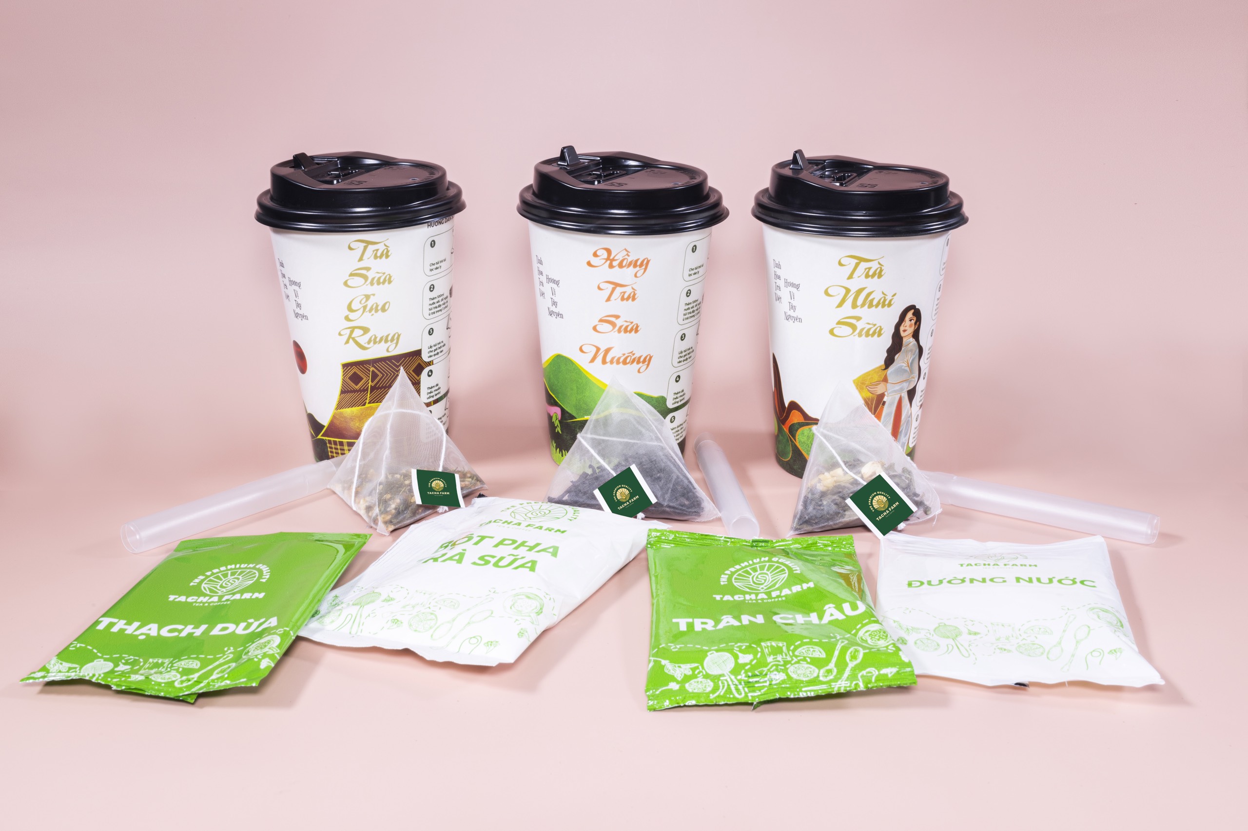 Trong 1 ly trà sữa tự pha TACHA FARM vị Hồng Trà sữa nướng gồm: - 1 Túi trà túi lọc vị hồng trà nướng - 1 túi bột pha trà sữa - 1 túi
