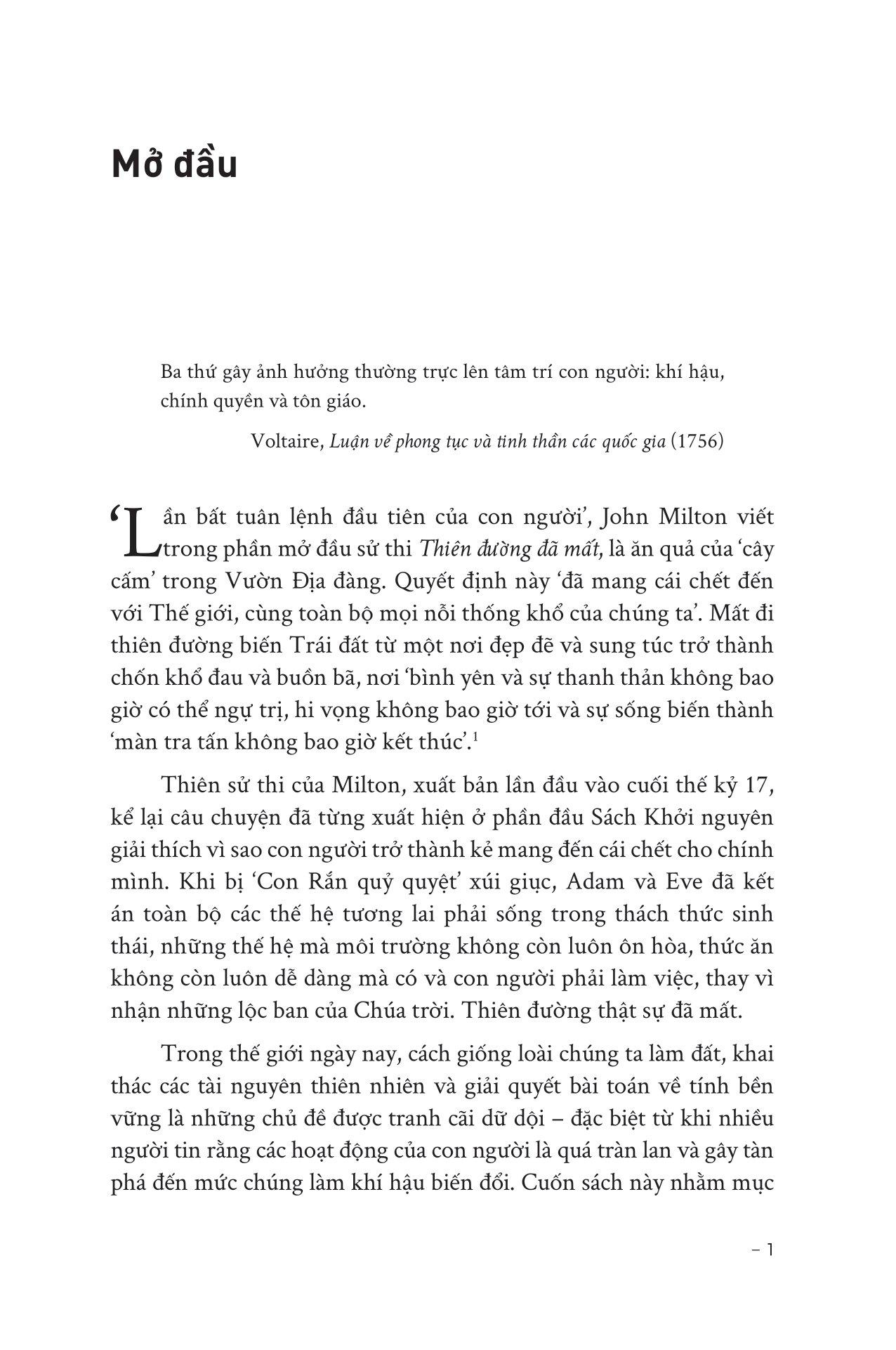 - Cuốn sách này không nói về những gì sẽ diễn ra trong tương lai. Mục đích của nó không phải để thách thức những tiếng nói đồng thanh mang tính áp đảo của cộng đồng khoa học, cũng không tập trung vào các điều kiện toàn cầu hiện tại hay xem xét những bước đi nào có thể giảm thiểu một số hoặc thậm chí là nhiều vấn đề tồi tệ nhất do biến đổi khí hậu đặt ra, dẫu là qua sự thích nghi hay giới thiệu những công nghệ mới. Thay vào đó, mục đích của nó là xem xét quá khứ, hiểu và giải thích chúng ta đã ở vào vị thế mà nay có vẻ thật hiểm nghèo như thế nào. Ban đầu, tôi nghĩ m.ình sẽ chỉ viết về lịch sử, rằng khí hậu đã định hình thế giới quanh ta như thế nào, và về những chiều hướng mà những biến chuyển trong nhiệt độ toàn cầu, lượng mưa và mực nước biển – cùng những hiện tượng cực đoan, như siêu bão, núi lửa phun trào và va chạm thiên thạch – đã ảnh hưởng lên quá khứ, sắp đặt nên những khoảnh khắc, những thời kỳ và bối cảnh giải thích vai trò quan trọng đến nhường nào của khí hậu trong lịch sử thế giới. Tuy nhiên, mọi sự rất sớm rõ ràng khi tôi bắt đầu nghĩ về một cuốn sách sẽ mở ra cánh cửa với khí hậu, với những thay đổi trong các kiểu quy luật thời tiết và với tác động của con người lên thế giới tự nhiên, nó sẽ dẫn tới một loạt câu hỏi và thách thức lớn hơn rất nhiều về mối quan hệ giữa dư thừa nông nghiệp và sự ra đời của nhà nước quan liêu; về mối liên quan giữa một bên là những người mục súc, du mục và bên kia là xã hội định canh định cư trong những ngôi làng, thị trấn và thành phố; về vai trò và sự phát triển của tôn giáo và các hệ thống tín ngưỡng như một hàm số của khí hậu, môi trường và địa lý; về c.hủng tộc và chế độ nô lệ, và vai trò của chúng trong quá trình khai thác các tài nguyên; về sự mở rộng của lương thực, mầm bệnh và bệnh tật; về chế độ dân chủ, nghèo đói và các mô hình tiêu thụ trong nhiều thế kỷ kể từ cách mạng công nghiệp; về toàn cầu hóa, tiêu chuẩn hóa của công nghiệp, nông nghiệp, lương thực và thời trang trong thế kỷ gần đây nhất; về nguyên do thế kỷ 21 rơi vào thời khắc khủng hoảng. Do đó cuốn sách này có ba mục đích. Thứ nhất là đưa khí hậu vào trong câu chuyện của quá khứ như một chủ đề cơ sở, mang tính cốt yếu và hay bị bỏ qua trong lịch sử toàn cầu, từ đó cho thấy ở đâu, khi nào và như thế nào mà thời tiết, các mô hình khí hậu kéo dài và những thay đổi trong khí hậu – do con người và do các nguyên nhân khác – lại có tác động to lớn đến thế giới. Thứ hai là trình bày câu chuyện về tác động của con người với thế giới tự nhiên qua nhiều thiên niên kỷ và xem xét cách thức loài người chúng ta khai thác, nhào nặn và uốn nắn môi trường theo ý chí của m.ình, cả mặt tốt lẫn mặt xấu. Và thứ ba là mở rộng tầm nhìn của chúng ta về lịch sử. Nghiên cứu về quá khứ từng bị thống trị bởi sự chú ý dành cho ‘thế giới phương bắc’, là những xã hội giàu có của châu Âu và Bắc Mỹ, còn lịch sử của các châu lục và khu vực khác thường bị xếp vào mức độ quan trọng thứ yếu hoặc bỏ qua hoàn toàn. Chính kiểu mẫu này cũng được áp dụng cho khoa học khí hậu và nghiên cứu về lịch sử khí hậu, nơi những khu vực rộng lớn, giai đoạn và con người nhận được ít sự chú ý, nghiên cứu hay đầu tư – nó nói lên nhiều điều về những quan điểm đã được chấp nhận từ lâu về quá khứ cũng như thực tế phát triển và hoạt động đào sâu vào thực tiễn của các quỹ học thuật (và các trung tâm trí thức). Nếu những điểm trên hướng đến một lý do căn bản để đánh giá lại lịch sử, thì sự nhấn mạnh quá mức của các sử gia rằng các thị trấn, thành phố và quốc gia giống nhau về sự lãnh đạo, bộ máy quan liêu và hành vi cũng cần như vậy. Thực vậy, bản thân từ ‘nền văn minh’ về nghĩa đen để chỉ đời sống của các thành phố, của những người sống trong nó và người phóng chiếu quyền lực và cai trị nó. Điều này được phản ánh trong hầu hết các tư liệu viết mang tính lịch sử – các bài tường thuật, các ghi chép về bán đất, các hóa đơn thuế, – phục vụ cho việc củng cố sự cai trị theo tôn ti thứ bậc. Rất nhiều nội dung lịch sử được viết bởi những người sống ở các thành phố, cho những người sống ở thành phố, và tập trung vào đời sống của những người sống ở thành phố. Việc đó làm lệch đi cách ta xem xét quá khứ và thế giới quanh m.ình. - Trích trang 28
