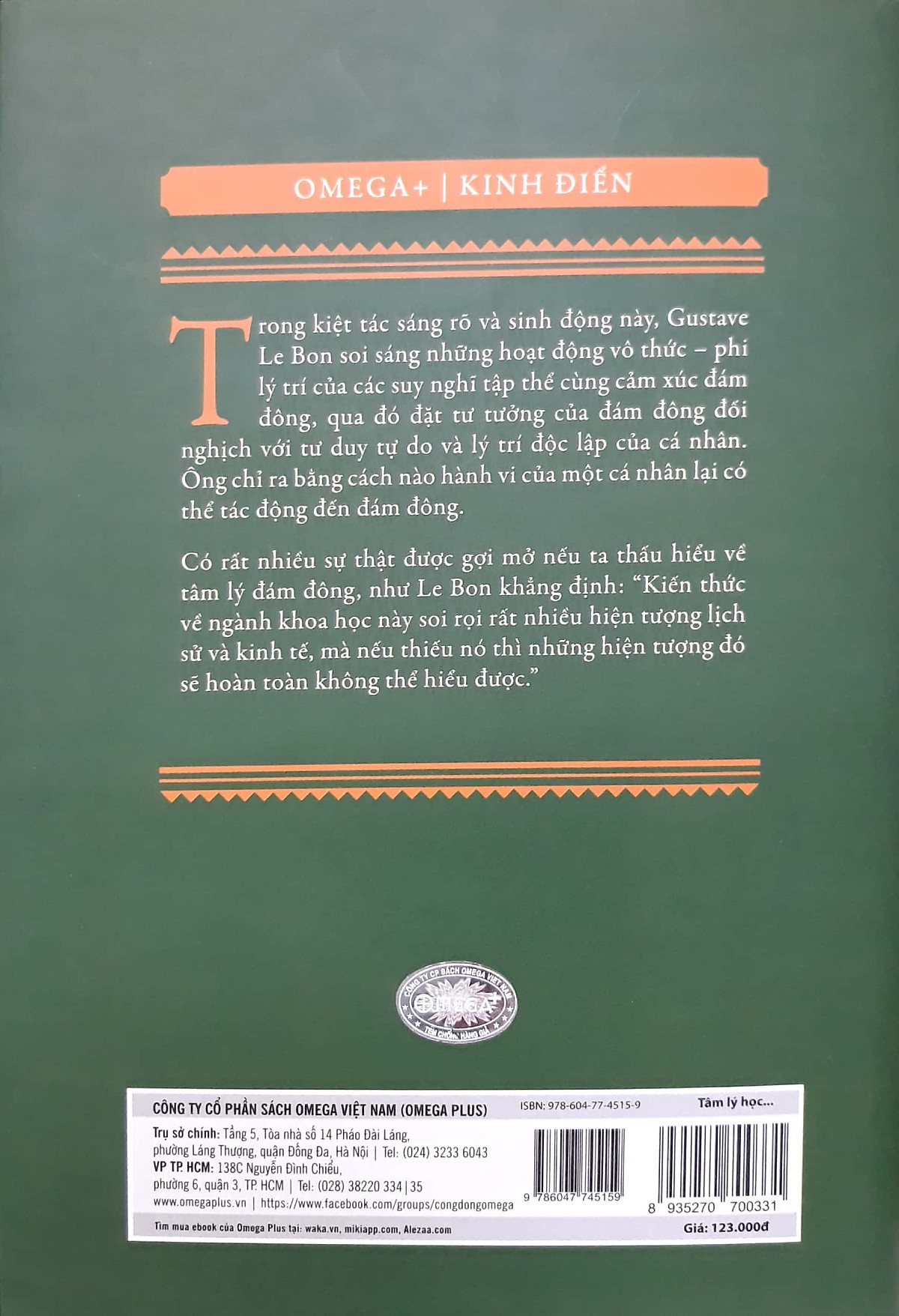 Trong kiệt tác sáng rõ và sinh động này, Gustave Le Bon soi sáng những hoạt động vô thức – phi lý trí của các suy nghĩ tập thể cùng cảm xúc đám đông, qua đó đặt tư tưởng của đám đông đối nghịch với tư duy tự do và lý trí độc lập của cá nhân. Ông chỉ ra bằng cách nào hành vi của một cá nhân lại có tác động đến đám đông.