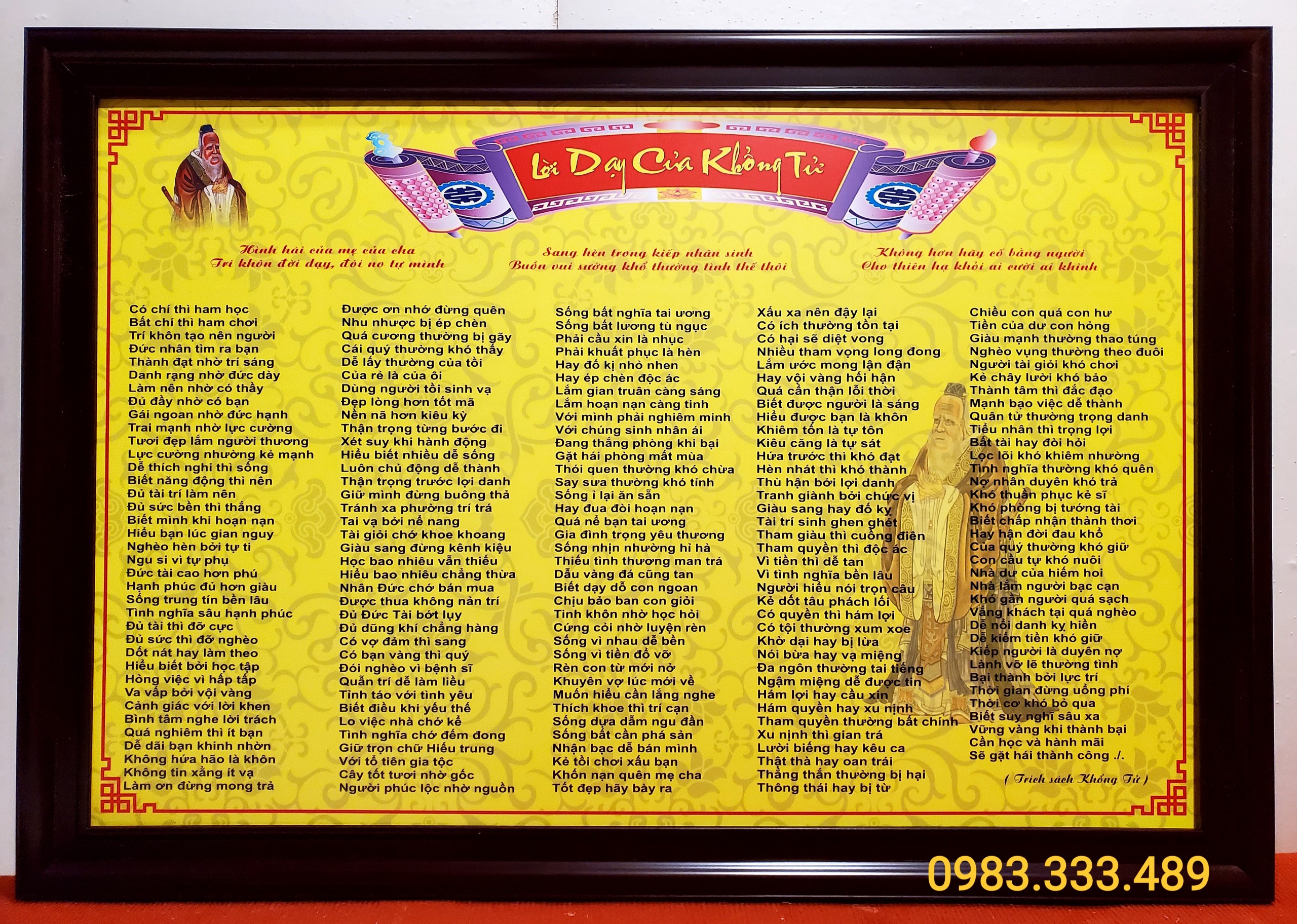 Mua tại TiktokThông tin chi tiết Tranh chữ lời dạy của khổng tử -ID189 Chất liệu tranh in dầu trên lụa cao cấp được phủ lớp pe bảo vệ bề mặt tranh, ép trên tấm pomex dày 5mm độ bền màu trên 10 năm. Tấm formex có trọng lượng nhẹ,không cong vênh mọi thời tiết, không thấm nước, dễ lau chùi bằng khăn ướt, không độc hại. Khung tranh composite màu vân gỗ hoặc hoa văn vàẹ chống mối mọt Khung tranh đóng chọn màu ngẫu nhiên.