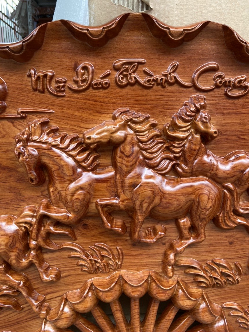 _ Tranh cánh quạt khắc tích mã đáo thành công được làm bằng chất chất liệu gỗ hương đỏ tự nhiên 100% _ Kt 50×100 dầy 4cm _ Tranh được khắc nổi tỉ mỉ ,tinh