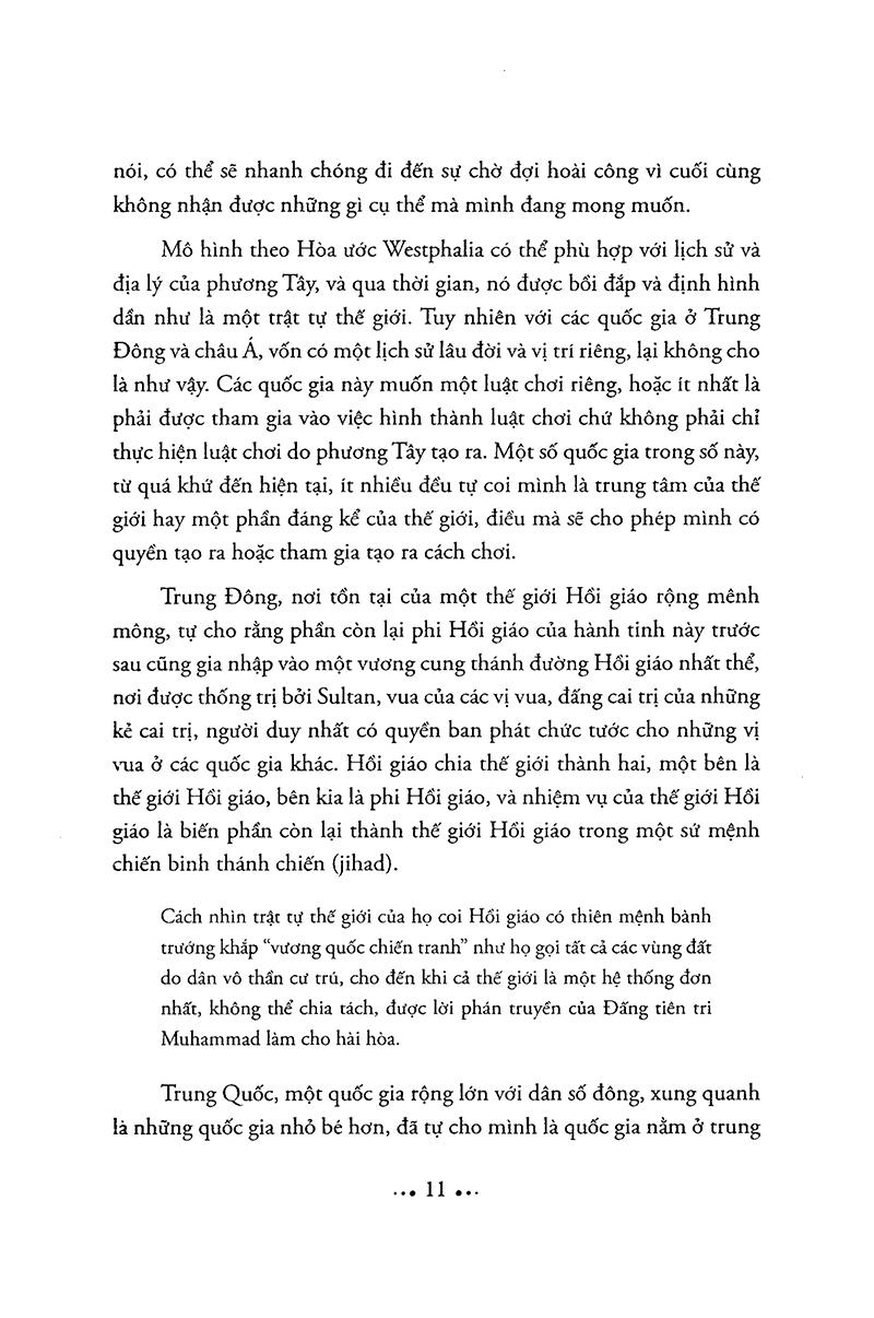 Mua tại TiktokTrật Tự Thế Giới (Tái Bản 2023) Trong tác phẩm, Kissinger xuất phát từ Hòa ước Westphalia để phân tích về tương quan giữa các nước, chủ yếu là các cường quốc và các khu vực giữ một vai trò đặc biệt đối với bức tranh địa chính trị thế giới, với những khác biệt trong thế giới quan và vị trí địa lý đã ảnh hưởng đến chính sách ngoại giao của mỗi nước như thế nào. Tác giả dành chương cuối (chương 9) để bàn về vấn đề toàn cầu hoá trong thời đại khoa học công nghệ, đặc biệt là tin học và truyền thông đại chúng lan tràn đã tác động mạnh mẽ đến dư luận, các nhà lãnh đạo và các quyết định chính trị hiện nay. Theo cách nhìn của Kissinger thì trật tự thế giới ngày nay cần được đặt trên hai yếu tố căn bản: