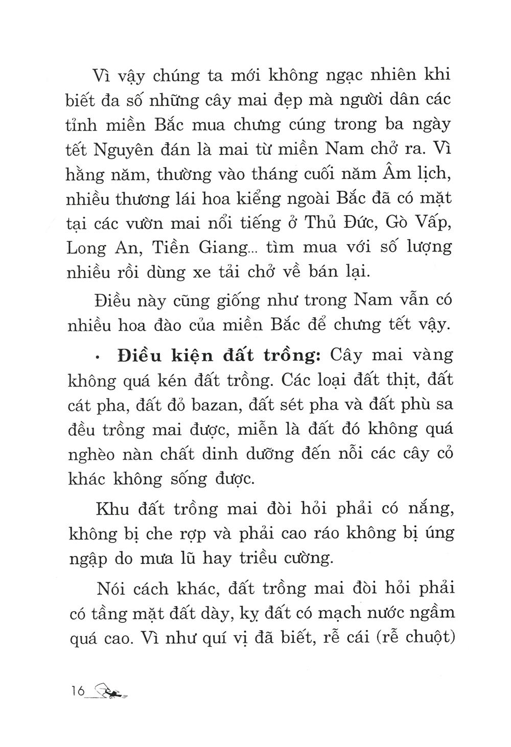 Muốn trồng được những cây mai đẹp đạt giá bán cao ngất ngưỡng như vậy, người làm vườn, tức là nghệ nhân hoa kiểng phải dày công chăm sóc tưới bón, và hằng ngày quan tâm đến việc phòng trị các loài sâu rầy và bệnh hại cho cây. Cuốn sách giới thiệu về kỹ thuật trồng, cách chăm sóc, tưới nước, phòng trừ côn trùng - bệnh hại cho cây mai.