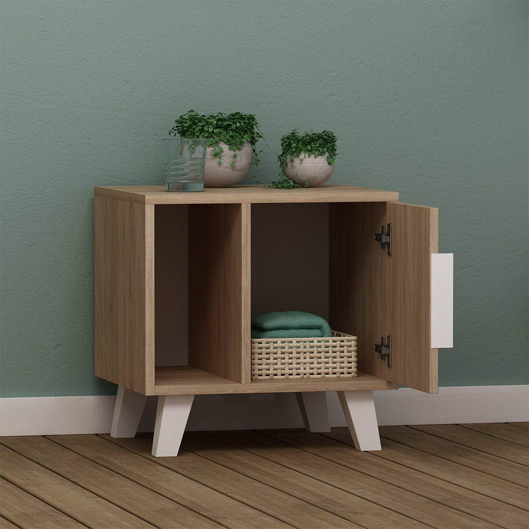 THÔNG TIN SẢN PHẨM - Tên sản phẩm: Tab đầu giường phong cách Nordic - Chất liệu: Gỗ MDF phủ melamin, chân gỗ sồi tự nhiên - Màu sắc: Trắng - Vân gỗ - Cấu